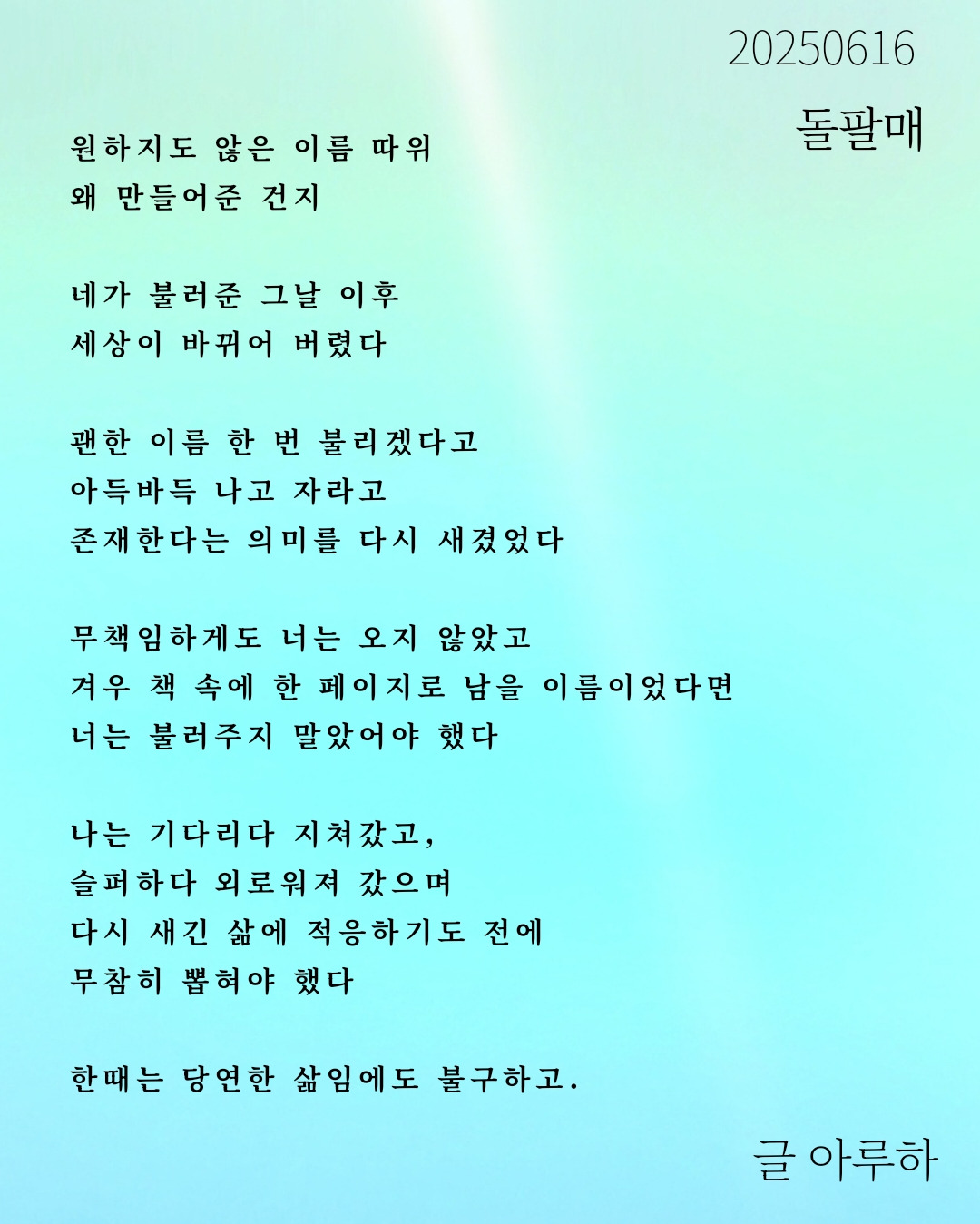이름 모를 잡초라 불리는 세상의 모든 풀은 사실 이름이 있다. 그러나 이름으로 불리기보다는 '잡초'라는 통칭으로 불린다. 이 글은 이름은 있으나 불리지 못하는 잡초를 빗대어 썼다.