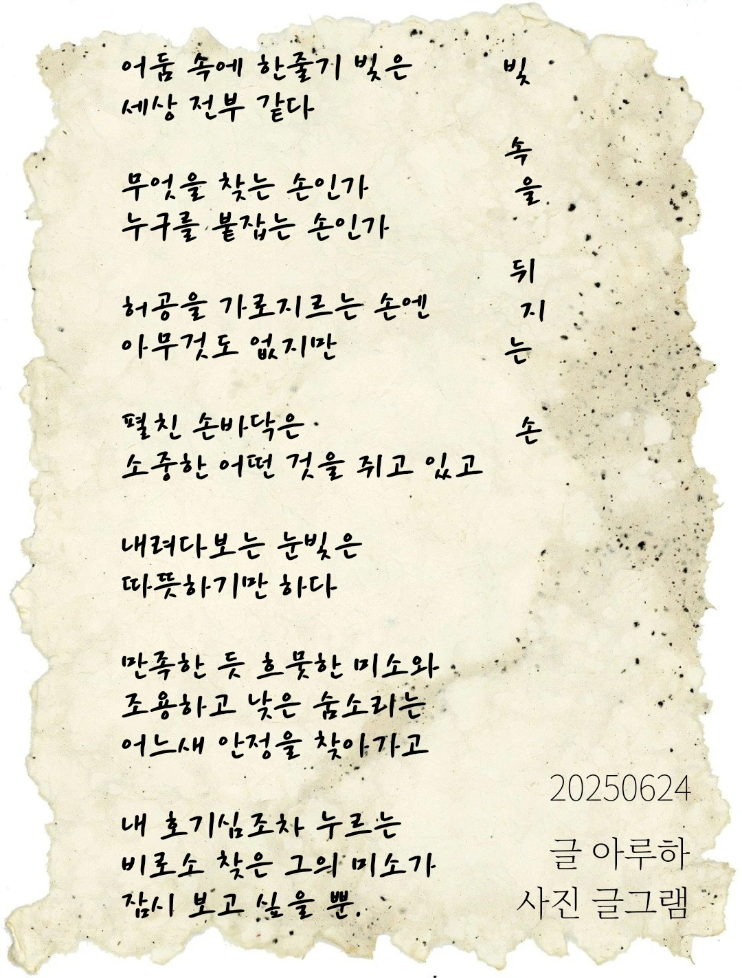 아름다운 그림을 보면 영감이 떠오른다. 오늘 본 그림은 손동작만 들어간 연속작이었다. 짙은 어둠 속에 빛을 가르고 나타난 손은 무언가를 찾는 것처럼 보였다. 혹은 누군가를 찾는지도 모르겠다.