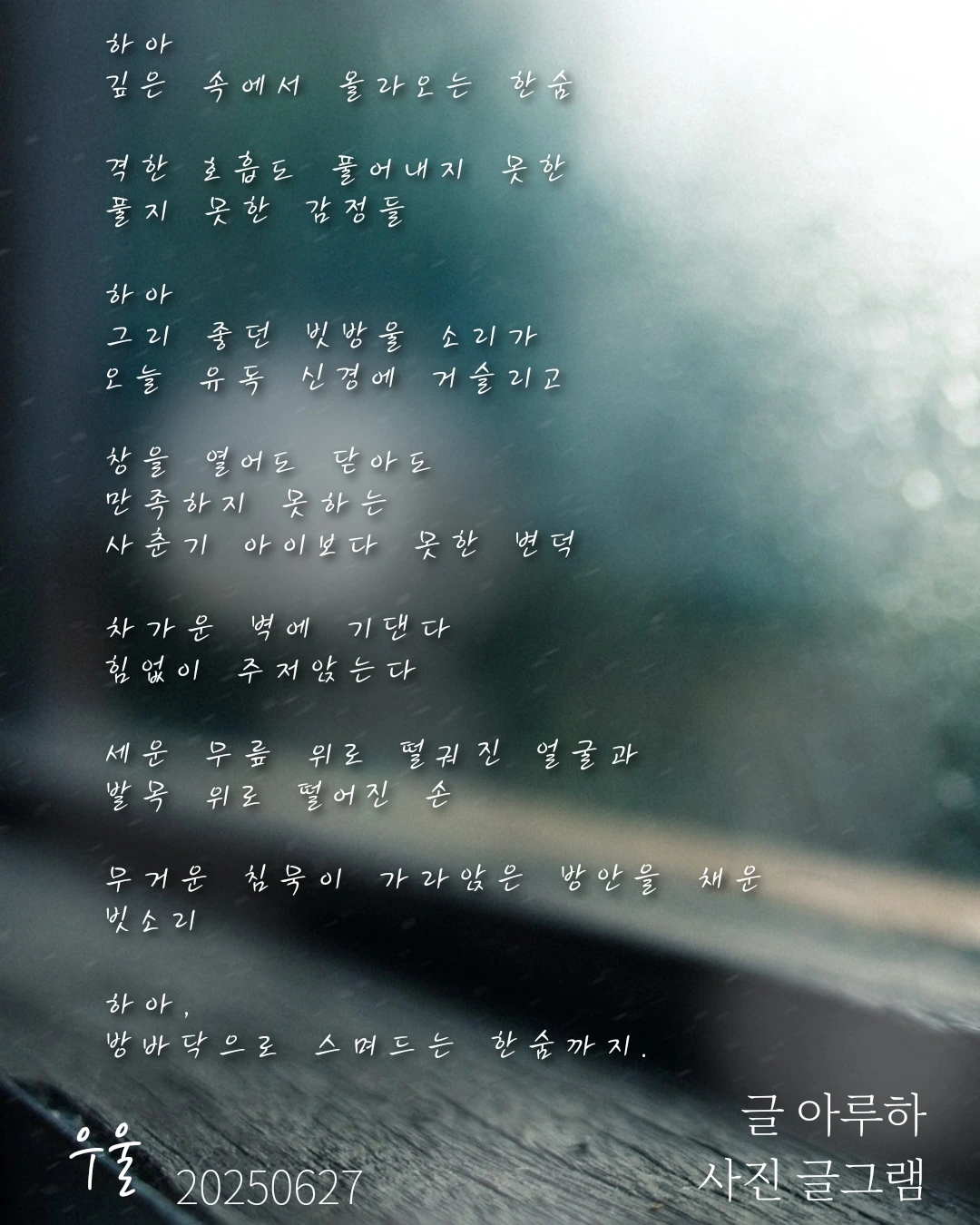 마음이 힘들어 우울한 글만 쓴다던 말에 우울이라는 감정을 표현했다. 마침 비가 내릴 듯 흐린 밖을 보면서 '비와 하아'를 중심으로 글을 엮었다. 처음 우울이 시작한 단계에 한숨과 중반부, 후반부에 이어지는 동안 감정은 더 바닥으로 꺼진다.