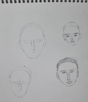 본격적으로 얼굴을 그리기 시작했다. 얼굴도 인체 비례도와 비슷하게 외워야 하는 비례도가 있었다. 얼굴은 정사각형의 도형에 2 분의 1 크기로 아래에 하나가 더 붙었다. 하관은 2분의 1 크기로 붙인 크기를 반으로 나눠서 세로로 다시 나누고 나눠서 그렸다.