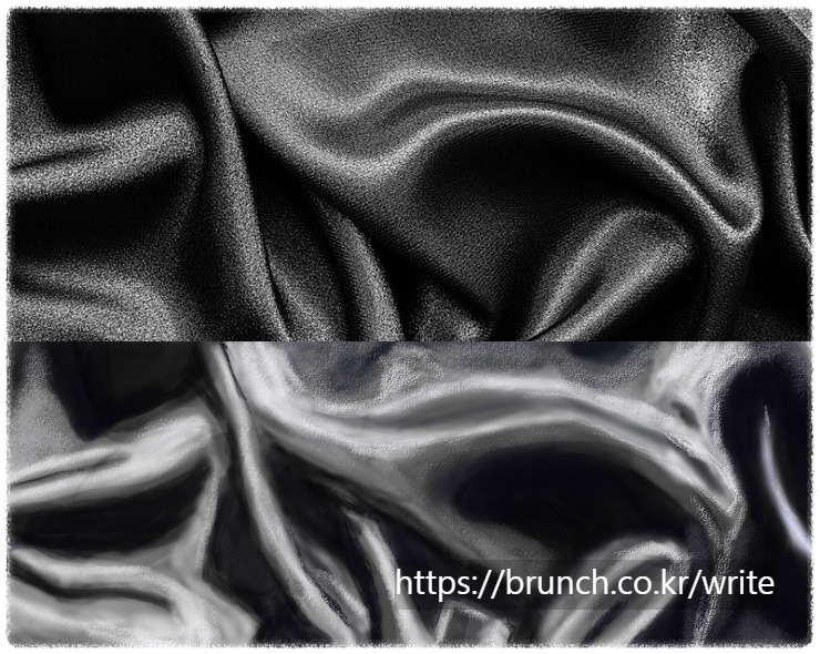 두 번째 수업은 바로 천의 구김이었다. 처음 그렸을 때는 전혀 명암이 나오지 않았다. 그런데 이미 일러스트 작업을 하고 있는 지인이 브러시의 색을 연하게 해서 쓰는 방법을 알려주었다. 선생님은 일부러 안 알려주었는데, 먼저 배웠다며 웃으셨다. 덕분에 비슷하게 만들 수 있었다. 맞다. 그냥 비슷하게 표현했을 뿐이다. 처음 치고는 잘했지만, 기 작가님들이 보기엔 어설프기 짝이 없을 실력이었다. 그나마 옆에 지인이 잘 알려준 덕이었다. 시범을 보이고, 요령을 가르쳐 준 덕에 브러시 사용이 좀 편했다. 덕분에 배운 브러시 말고 다른 것도 써 볼 수 있었다. 선생님은 가만히 지켜볼 뿐이었지만, 나중에 알아야 하는 것인데 미리 알았다며 이번에도 역시 웃었다.