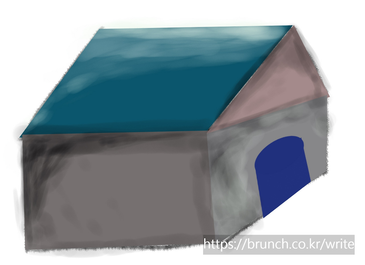 원래는 사각형, 삼각형, 원기둥, 직사각형을 그려야 했다. 하지만 나는 시간이 없었다. 집에 가서 완성할 수도 없고, 그렇다고 다음 날 그리려고 하면 그날 수업을 제대로 익힐 수가 없었다. 집에 가서 할 수 없는 숙제를 두 번째 수업에서 하려면 하나로 합쳐서 그려야 했다. 그래서 선택한 게 낡은 슬레이트 집이었다. 명함을 넣는 법을 가르쳐 주셔서 해 보았지만, 오히려 엉성한 낡은 집이 되었다. 일단 이것으로 1교시 수업 과제를 마쳤다.