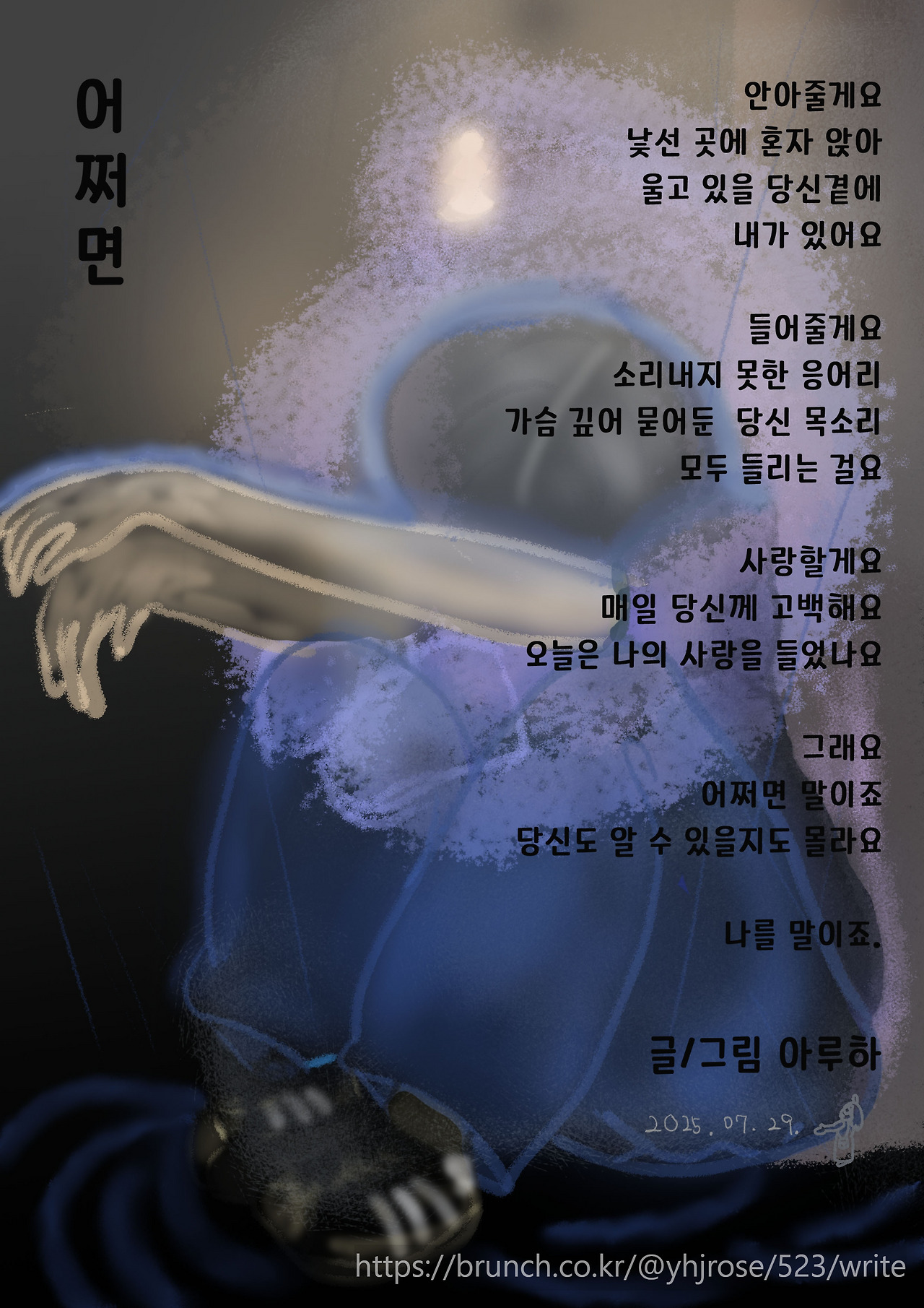 공들어 그렸다. 먼저 색을 칠하고, 그 위에 라인을 그렸다. 진짜 필요한 선만 그려 넣어서 마치 지금 이 사람이 얼마나 힘든지 알 수 있도록 노력했다. 뒤에서 앉아주는 존재는 모든 것이다. 요정일 수도 사람일 수도 바람일 수도 있다. 그저 당신이 혼자라고 생각되는 그 순간도 누군가 있다는 메시지를 담고 싶었을 뿐이다. 그래서 제목도 '안아줄게요'가 아니라 '어쩌면'이 맞다.
