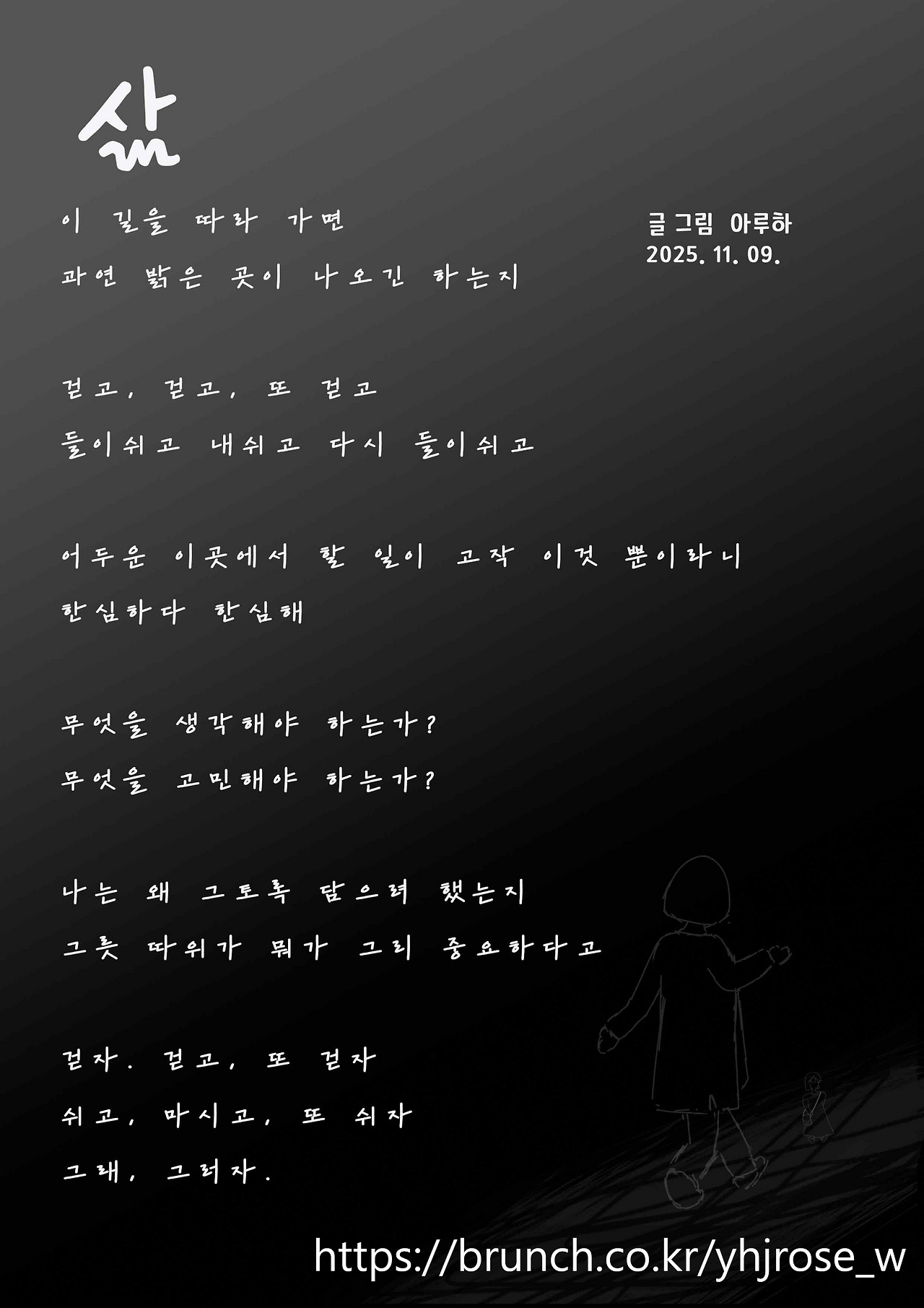 살다는 표현을 대부분 나아간다라고 표현한다. 나아간다는 건 걷는다는 의미도 있다. 나는 이렇게 삶이라는 단어를 검색하면 나올 법한 연관 검색어의 종합으로 삶을 표현했다.