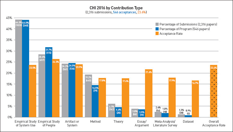 워싱턴 주립대의 Wobbrock 교수님과 Kientz 교수님의 "Research Contributions in Human-Computer Interaction"이라는 아티클에서 가져온 통계자료인데, CHI 2016 학회의 제출 논문들과 승인 논문들을 컨트리뷰션별로 분류해놓은 것이다. Artifact of System에는 대부분 프로그래밍이 필요한 산출물들이 나오고, Empirical Study도 스터디를 위해 앱을 만들어 배포하는 등 프로그래밍이 필요한 경우가 많다. HCI 연구에 반드시 구현이 필요한 것은 아니지만, HCI를 공부하게 된다면 아무래도 구현이 들어간 논문들을 많이 접하게 되고, 구현능력이 있으면 더 넓은 HCI의 영역을 건드릴 수 있다.