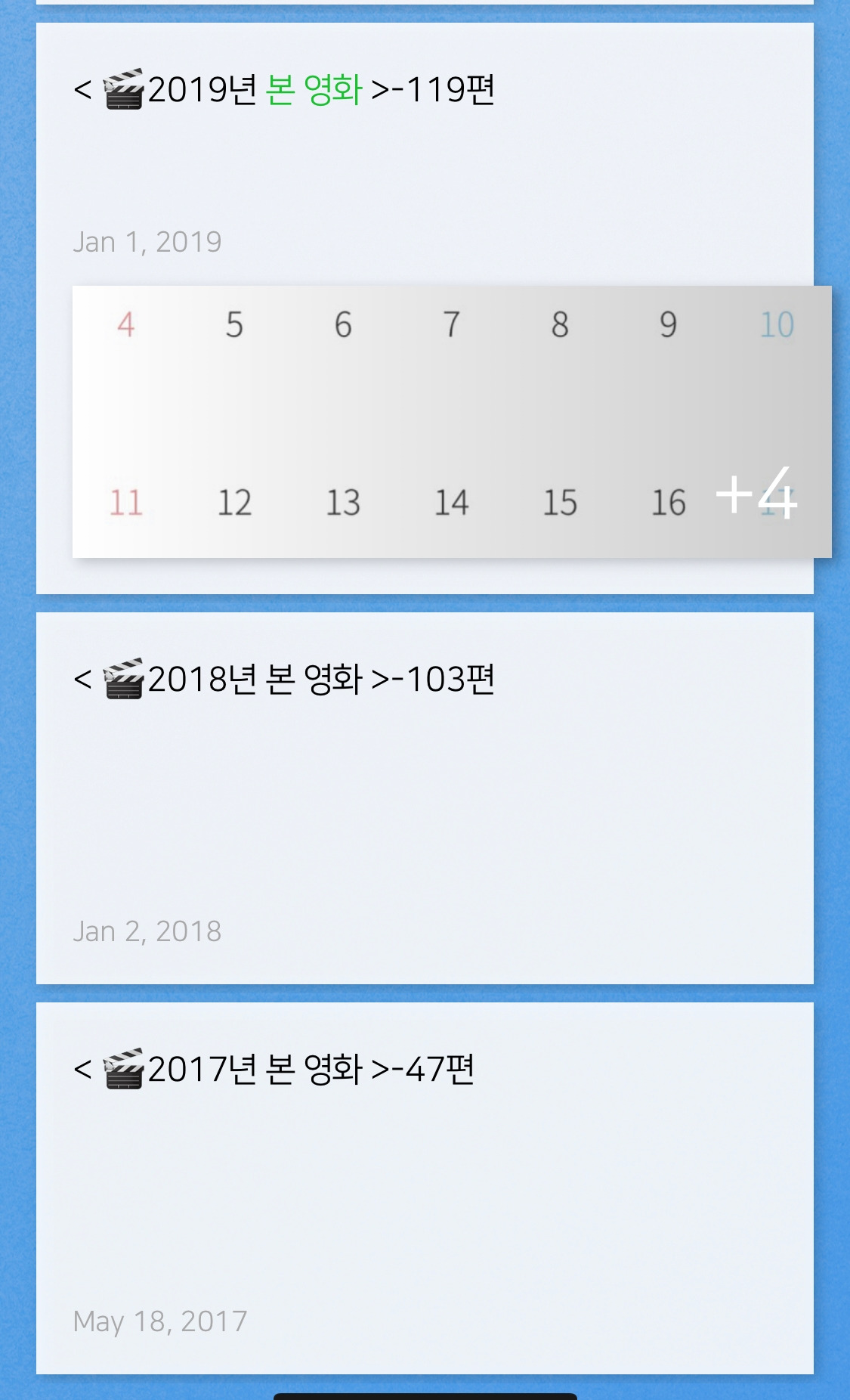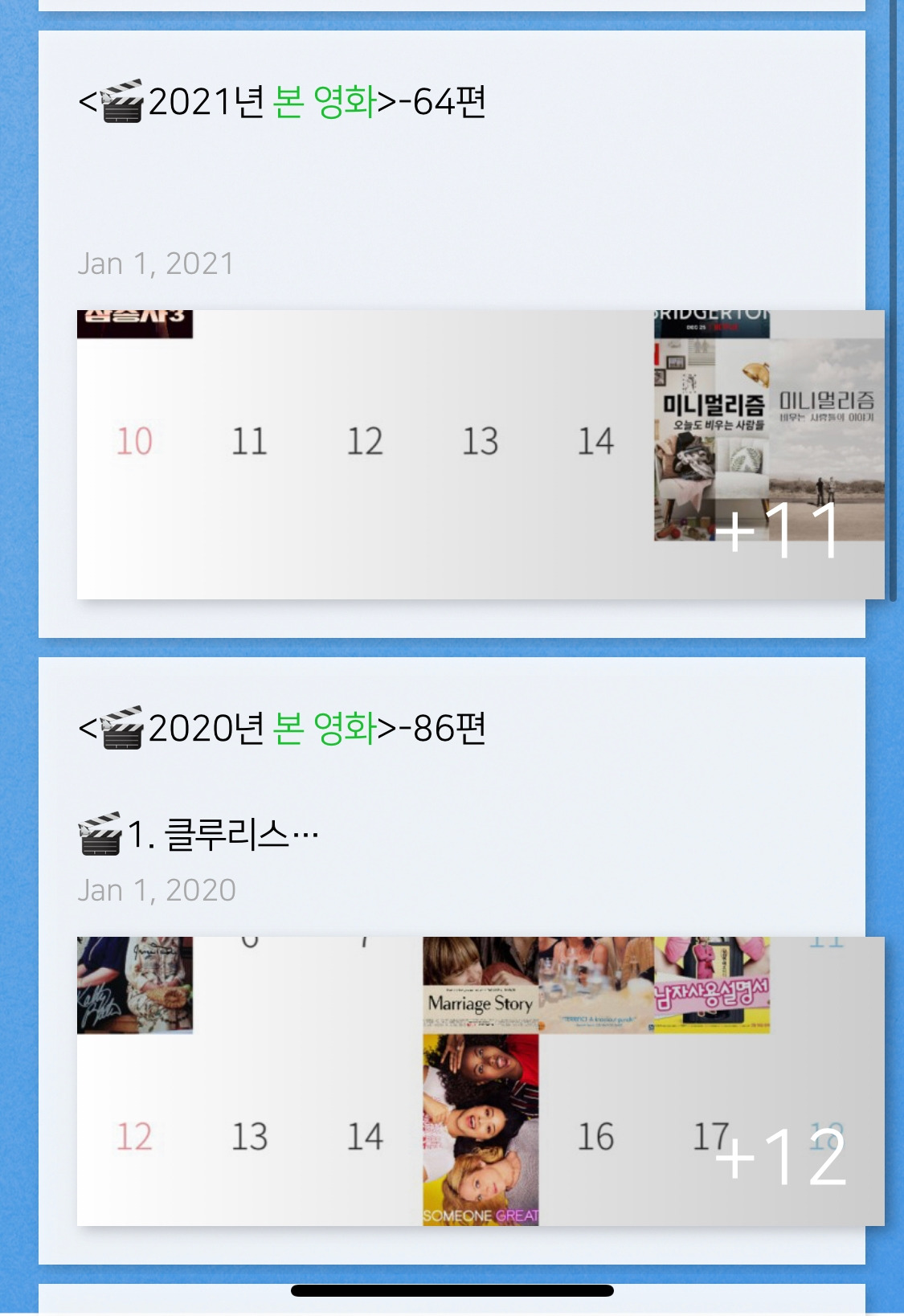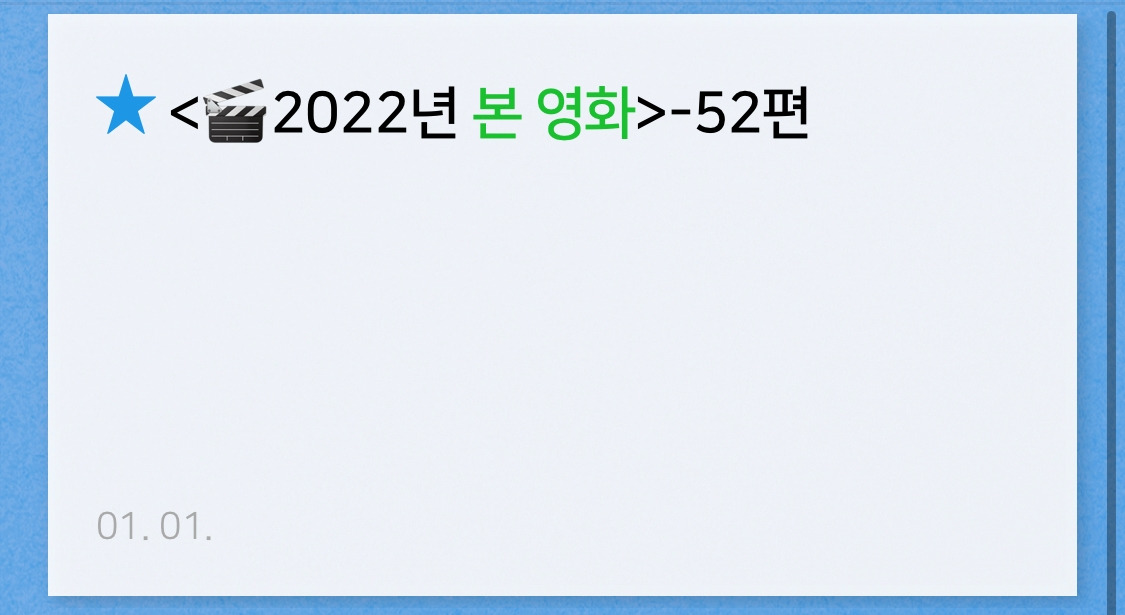 영화 보는 것을 좋아한다. 지금까지 736편의 영화를 보았다. 1337시간을 돌파했다. 50일 동안 쉬지 않고 영화를 본다면 가능한 시간이다. 2017년부터는 메모장에 감상평을 남기기 시작했다. 2019년부터는 감상평을 쓰면서 시청일에 영화 포스터를 게시할 수 있는 어플을 사용했다. 2022년 10월 28일 현재까지 5년 동안 371편의 영화를 보고 감상평을 써왔다.