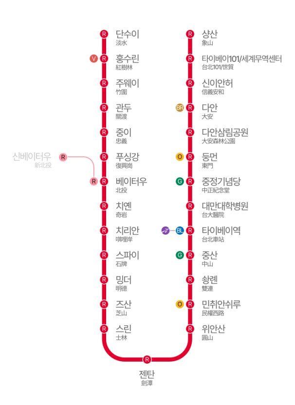 타이베이역에서 단수이에 가기 위해서는 빨간색의 단수이-신이선(Tamsui-Xinyi Line)을 타야 한다. 전철은 淡水(Tamsui) 단수이라고 적힌 전철과 北投(Beitou) 베이터우라고 적힌 전철이 번갈아 오는데 우리나라의 ~행 열차를 생각하면 된다. 베이터우행을 타면 베이터우까지만 가기 때문에 내려서 한 번 더 갈아타야 한다. 둘 다 갈 수는 있지만 아무래도 단수이행을 타고 가는 것이 굳이 환승할 필요가 없어서 마음이 편할 것이다.