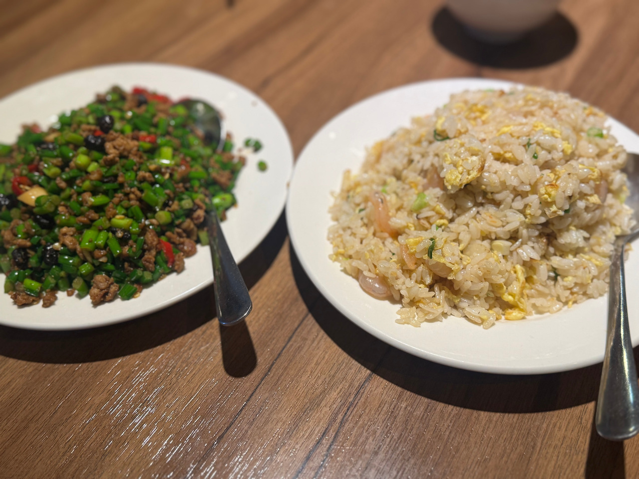 다음은 부추꽃볶음이다. 부추를 잘게 썰어 고기와 함께 볶은 메뉴인데, 들었을 때는 평범하게 들리지만 알고 있는 부추의 식감과는 조금 다른, 마늘종에 가까운 식감이었다. 굉장히 아삭아삭해서 씹는 맛이 있었고, 고추가 들어가서인지 꽤나 매웠다. 요리라기 보다는 반찬에 가까운 느낌이라서 같이 시킨 새우볶음밥과 매우 잘 어울렸다.