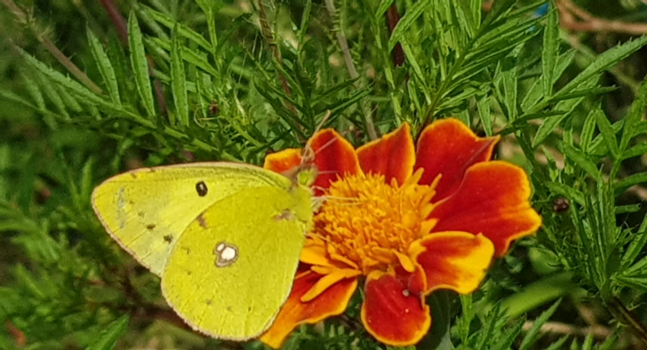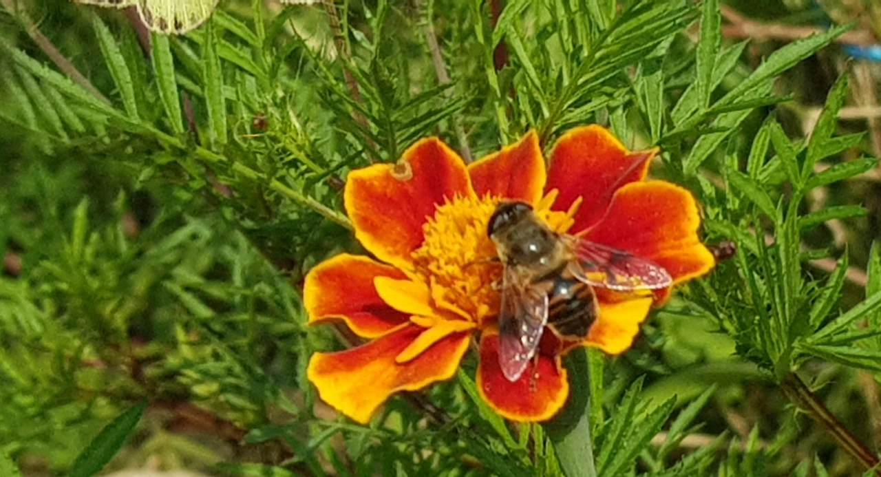 카페 앞 넓은 뜰에 핀 골드 메리 꽃송이에 나비와 벌들이 분주하다.