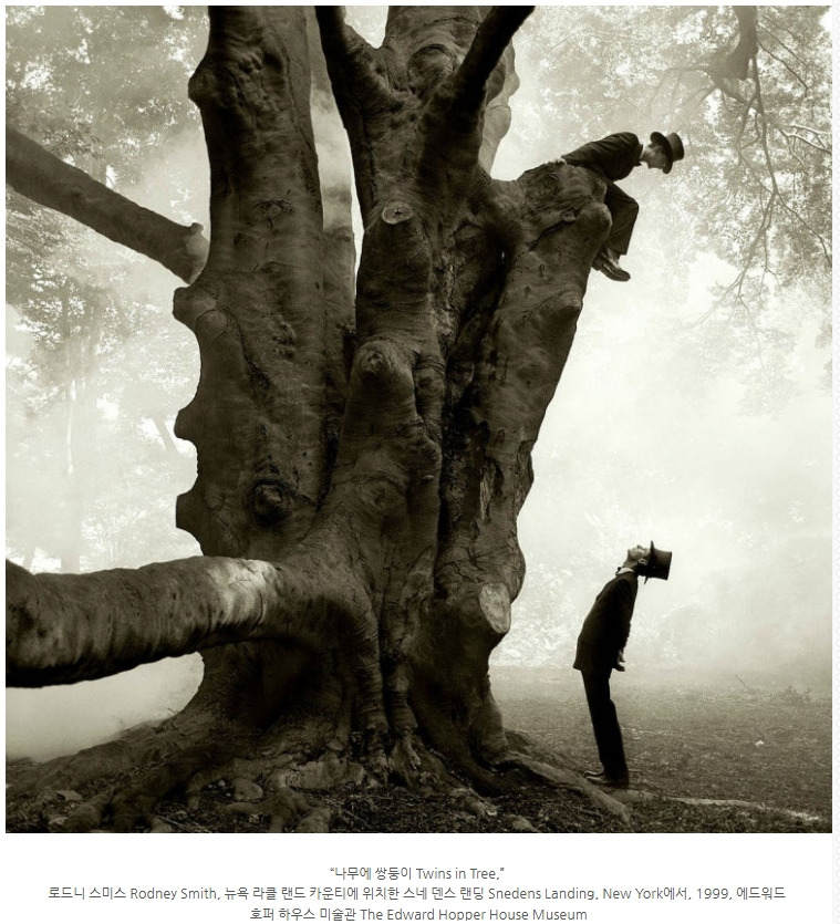 목사가 되겠다고 신학교에 입학한 로드니 스미스(Rodney Smith)의 운명은 사진가 워커 에반스를 만나면서 바뀌었다. 그가 사진은 르네 마그리트처럼, 유머와 위트가 있으면서도 사고를 자극하는 자신만의 매력을 사진에 담았다. 25년 동안 그의 사진집 <The End>로 국제 사진작품상을 포함하여 50여개의 여러 상들을 받았다. 그의 사진중에 인상적인 사진 하나가 있다. <Twins in Tree>는 나무위에 모자를 쓴 중절모의 남자가 아래 모자를 쓴 남자를 내려다보면서 대화를 나누고 있는 것처럼 보인다. 아래의 사람의 현실의 자아이고, 위의 사람은 미래의 자아이다. 또 다른 자아에게 마치 질문을 하는 듯하다.