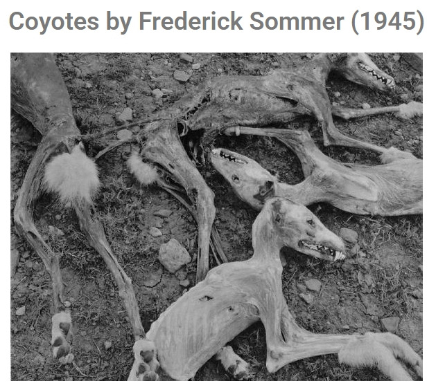 “코요테(Coyotes)”라는 제목의 이 사진은 1945년 프레드릭 좀머(Frederick Sommer)가 촬영한 것이다. 이 흑백 이미지는 자연 환경에서 분해되도록 방치된 흩어져 있는 코요테 사체들의 극명하고 다소 충격적인 이미지를 보여준다. 동물들은 다양한 부패 상태에 있으며, 뼈가 드러나 있고 털이 다양한 분리 단계에 있으며, 건조하고 바위처럼 보이는 땅에 흩어져 있다. 이 장면의 구성은 죽음과 부패의 잔인한 현실을 자연 속에서 보는 사람에게 보여주며, 삶의 과도기와 피할 수 없는 시간의 진행을 은유적으로 강조하고 있다.