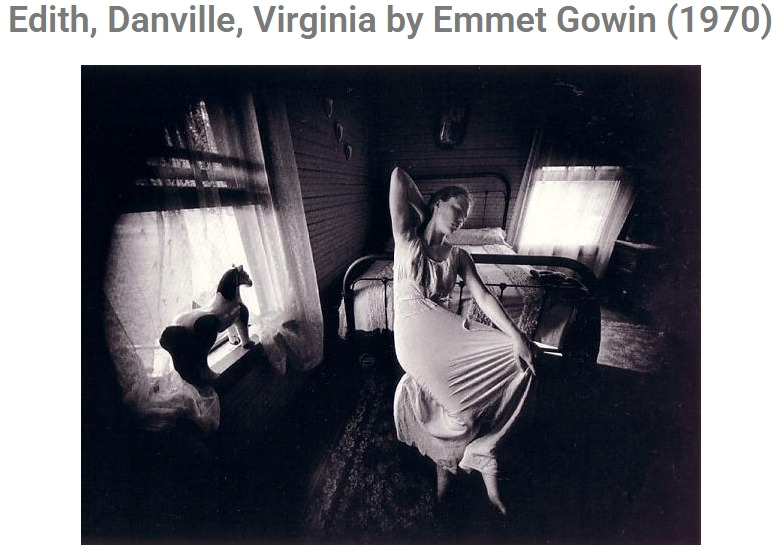 엠멧 고윈(Emmet Gowin)는 초기에 그의 아내와 가족들의 일상을 주로 사진을 찍었다. 그의 사진은 마치 초현실적으로도 보인다. 80년대부터는 항공촬영으로 지상의 사람들로 인한 환경파괴, 개발현장들을 사진에 담았다. 엠멧 고윈의 주관심사는 바뀌었지만 그는 한번도, 이젠 64가 된, 에디스를 찍는 것을 멈춘적이 없고 앞으로도 그럴 생각이 없다. <에디스(Edith)>라는 제목의 사진에서 보듯이, 1976년 엠멧은 “저는 신체와 성격이 부합하는 모습을 사랑에서 우러난 마음으로 그들이 보여주는 그대로에 집중하고 싶어요.”라고 쓴 적이 있다. 이제 65세가 된 지금의 엠멧 고윈은 이렇게 말한다. “작가로서의 제 삶은 에디스를 만나고 그녀에 대한 내 사랑과 매우 가깝게 놓여있어요. 작가로서의 일생과 그녀와의 삶을 따로 떼어 생각할 수 없습니다.” 사진 속에는 한 여성이 침대 가장자리에 앉아 사색이나 휴식을 암시하는 포즈를 취하고 있는 모습이다. 이 이미지는 창문을 통해 들어오는 빛의 극적인 조명을 사용하여 여성의 드레스 윤곽과 방의 특징을 강조하면서도 상당한 그림자를 드리우는 것이 특징이다. 왼쪽 창문 근처에는 흔들리는 말이 배치되어 있어 가정 내 가족이나 아이들의 존재를 암시하면서 초현실적인 분위기를 자아낸다. 가족을 주제로 한 사진가들은 많다. 엠멧 고윈의 사진은 자신이 사랑했던 주제, 가까운 사람들로부터 시작한다.