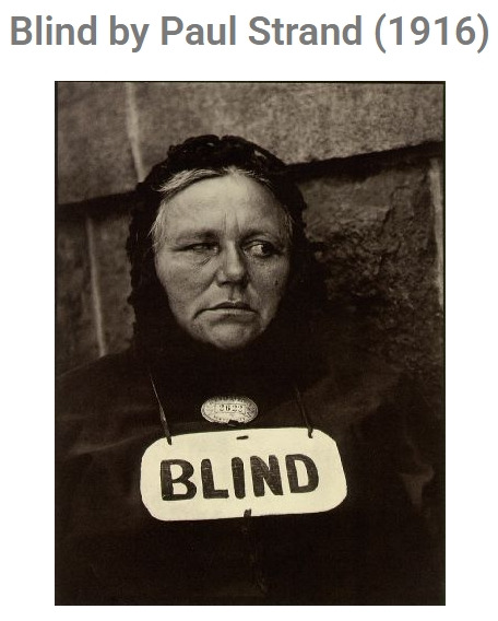 1916년 “맹인(Blind)”이라는 제목의 이 사진은 폴 스트랜드(Paul Strand)가 촬영한 것이다. 이 사진은 목에 “맹인(Blind)”라는 단어가 적힌 팻말을 목에 걸고 있는 할머니를 묘사하고 있다. 사진 속 여성은 엄숙하고 내성적인 표정을 짓고 있으며, 눈은 카메라에서 멀어져 있어 표지판에서 암시하는 것처럼 시야가 부족하다는 것을 알 수 있다. 이 사진은 임응식 사진의 <구직(求職)>과도 닮아 있다. 이 사진은 “우리를 주체-주체 관계가 아닌 주체-객체 관계—이 경우에는, 시각장애인 거지와 보고 있는 사진가 및 관람자 간의 관계—로 끌어들여 한탄하는 실명(blindness)을 만들어낸다”고 아도르노(Adorno)는 말한다. 사진속의 글자, 언어 지시적 속성은 사진속 대상을 규정하고 있다. 스트랜드의 포츄레이트(portrait)는 우리가 그것을 보는데 있어서 지표나 현상성(phenomenality), 그 두 가지 사이의 인위적인 다의(多義)성, 피사체의 상태에 대한 강력한 감정적 메시지를 전달하고 더 넓은 사회적 주제를 반영하는지에 대한 광범위한 해석을 만들어낸다. “흑인의 생명도 소중하다(Black Lives Matter)”과 같이 시위사진에서도 그들의 요구를 문자로 표현되는 경우가 종종 있다. 광우병 사태를 거치면서 우리사회도 다양한 손 피켓들이 등장했고, 피켓의 문구들은 그들의 목소리를 대변하고 있다.