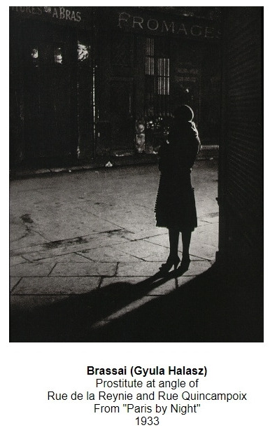 브랏사이(Brassaï)는 헝가리의 브라소(Basso)라는 지방도시에서 태어나, 1924년 파리에 정착했고, 파리에서 언론인으로 일하면서 많은 예술가들과 교분을 나눴고, 앗제가 파리의 새벽을 담았다면, 그는 파리의 밤풍경을 기록했다. 그의 초기 사진은 당시 예술가와 범죄자들의 지역으로 유명하던 파리 몽파르나스의 밤의 세계를 집중적으로 보여준다. 〈플라스 피갈 바의 보석 'Bijoux' in Place Pigalle Bar〉·〈매춘부 Streetwalker〉 같은 사진이 실린 〈파리의 밤 Paris de nuit〉이라는 사진집이 1933년에 출판되어 곧바로 성공을 거두었으며, 〈2명의 아파치 단원 Two Apaches〉과 같은 강렬한 작품을 싣고 있는 〈파리의 즐거움 Voluptés de Paris〉(1935)이 이어 출판되자 곧 국제적인 명성을 얻게 되었다. 〈파리의 밤> 사진집은 1933년 영국의 가장 권위 있는 사진문화상인 에머슨상을 받았다. ‘북회귀선’으로 잘 알려진 미국 소설가이자 브랏사이의 밤길 동무이기도 했던 헨리 밀러(Henry Miller)는 “브랏사이는 존재 자체가 살아있는 눈이었으며 그의 시선은 모든 것에 담긴 진실의 심장부를 바로 꿰뚫어보았다. 나는 매나 상어처럼 몸을 부르르 떨고 현실로 뛰어드는 그의 모습을 보았다”고 말했다.