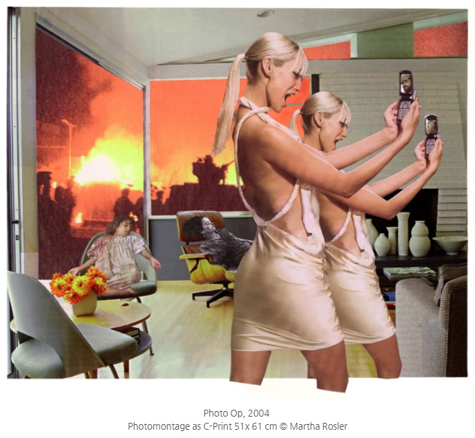 마사 로즐러(Martha Rosler)는 포토몽타주나 비디오작품, 사진 및 설치, 퍼포먼스 등 다양한 방법을 통해 사회에 대한 비판적 시각을 꾸준히 하고 있는 작가이다. 그녀는 페미니스트로 권력과 폭력이라는 주제를 다루고 있다. 미국의 보수적인 중상층 가정 안에 이와 대조되는 베트남, 이라크, 아프가니스탄의 전쟁 현장의 이미지를 병치시킨다. “House Beautiful: Bringing the War Home” <아름다운 집: 전쟁을 가정으로 가져오기> 시리즈는 전쟁의 폐해에 대한 작가의 경고를 표현한다. 어린 시절 가족과 함께 저녁을 먹으며 베트남 전쟁 뉴스를 시청하던 충격적인 경험을 바탕으로 만들어지게 되었다고, 그녀는 소개했다. 전쟁이 단순히 저 멀리의 일이 아니라 미디어와 소비문화 그리고 정치적 결정 속에서 일상의 일부로 존재한다는 점을 강조한다. 자크 랑시에르는 ‘감각의 분배’라는 개념으로, 예술은 새로운 감각 경험을 제공하고 기존의 감각 분배에 균열을 만들어냄으로써 개인을 정치적 주체로 거듭나게 할 수 있다고 주장한다.