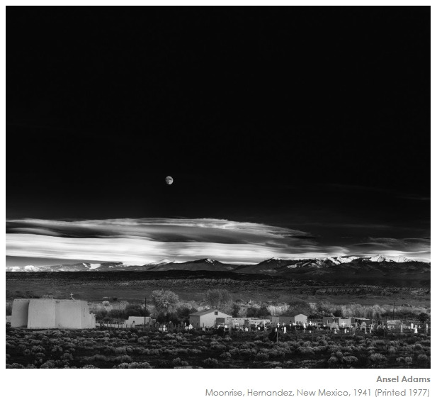 “Ansel was driving and Cedric (Cedric Wright one of Ansel’s best friends) was in the passenger seat. I was eight years old, half listening to the banter, watching the world fly by out the window. We were in Ansel’s old Pontiac station wagon, heading back to Santa Fe. It had been a long day and not apparently very successful. I don’t really remember any discussion about the potential of Moonrise at the time, only that we were moving really fast... Ansel was by nature prone to driving fast, but skilled and certainly not reckless. It was quite a shock therefore to suddenly be on the gravel shoulder of the road, fishtailing and dust flying as Ansel slammed on the brakes. “Hurry! Hurry! Hurry! Grab the camera case! It’s under there, get that out of the way. Where’s the tripod. Film holders! Hurry! Where’s the light meter? Oh, no the light’s going” Things were flying out of the car and onto the ground as we were frantically grabbing things that Ansel needed. Certainly not a direct quote but at the end of it, Ansel knew he had something. He didn’t find the light meter, but made his exposure based on the known luminosity of the moon – 250 foot candles. The rest, as they say, is history.”