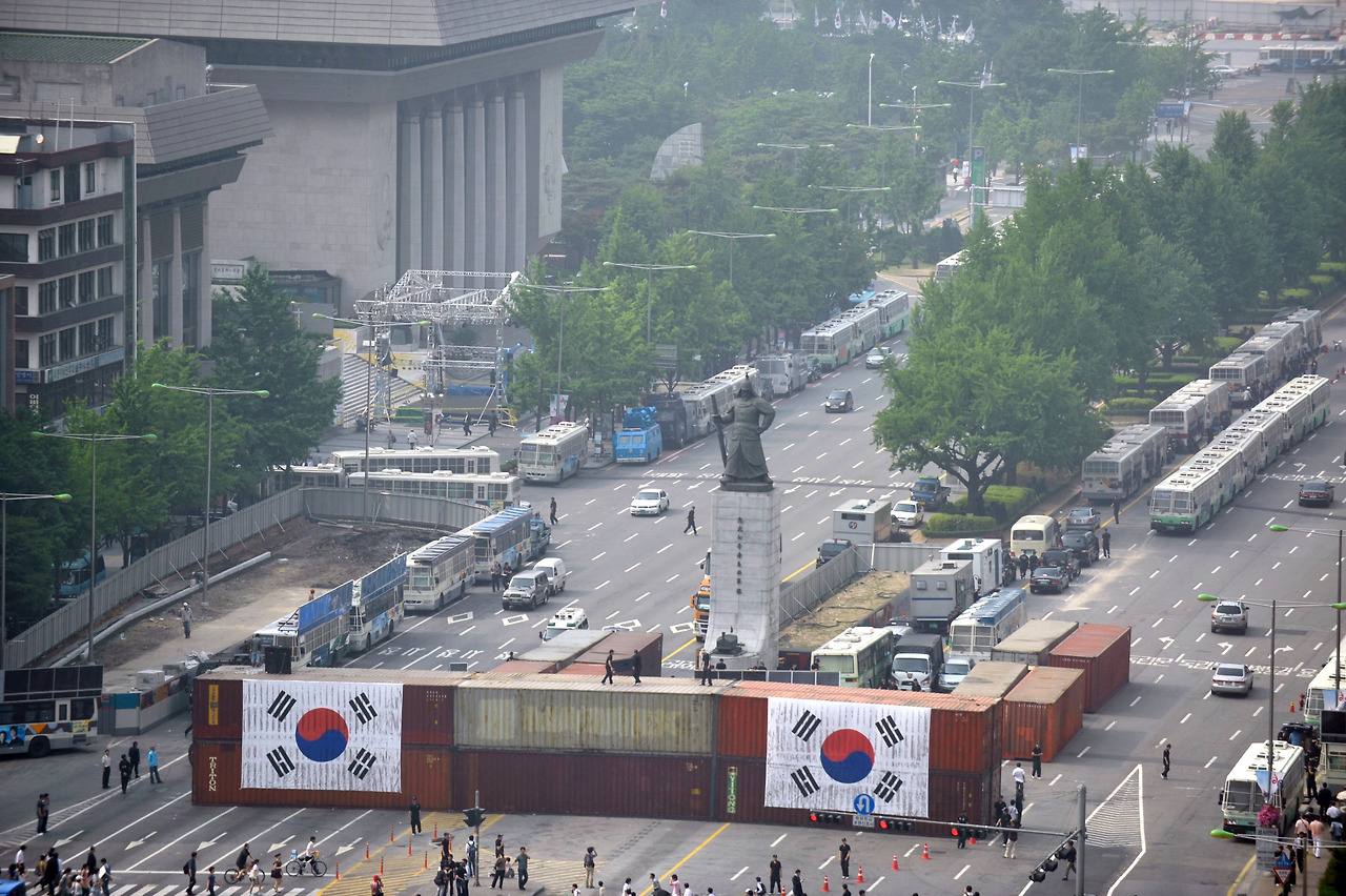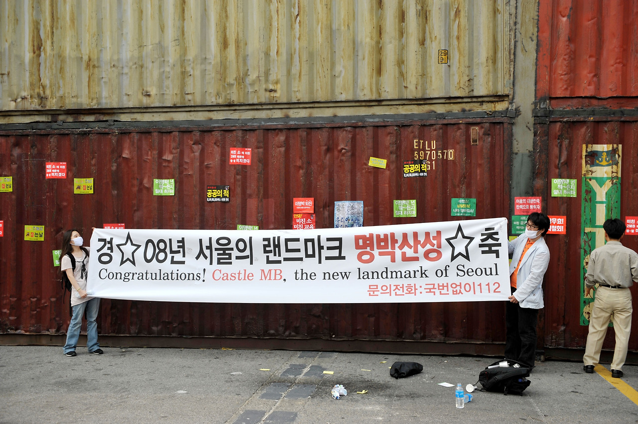 내가 사진을 쉼 없이 할 수 있던 자신감은 사실, 2006년 피카소전시장에서 사진기록 알바를 할 때부터였다. 사진을 전공하고 사진으로 직장생활을 하다 그만두고 돈에 항상 얽매였던 프리랜서 시절이었다. 이때의 경험은 단지 사진을 일로 여긴 것에서 사진이 취미로도, 그리고 사진을 대하는 태도나 생각들이 많이 변화를 가졌다. 뉴시스에 입사하고 그 즈음 2008년 광우병 촛불집회는 두 번째 새로운 경험을 가졌다. 문화연예담당 사진기자로 출근하여 퇴근시까지 맡았던 사진과 영상을 찍고, 집에 들어가는 길은 일이 아니었지만 광화문에서 벌어지는 집회를 1년내내 촬영하게 되었다. 일이라고 하면 야근자가 촬영할 일이었지만, 어차피 차벽으로 집에 가는 버스도 없고(당시는 부암동에 살았는데, 경복궁역을 차벽으로 막아났다) 그렇게 찍기 시작한게 1년이었다. 그렇게 명박산성은 내가 광화문을 기록하게 된 계기가 되었던 것 같았다.