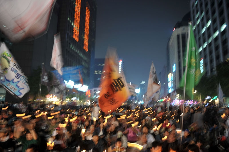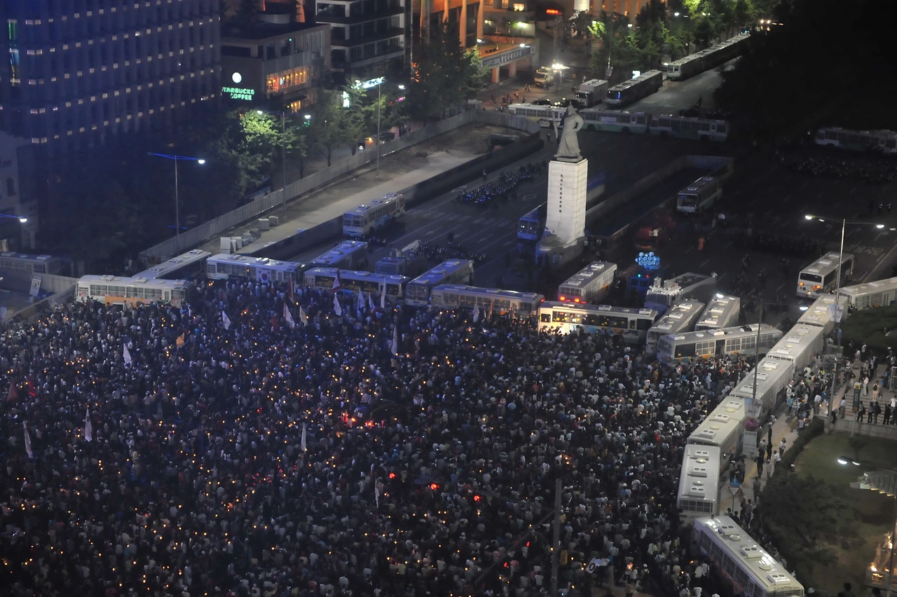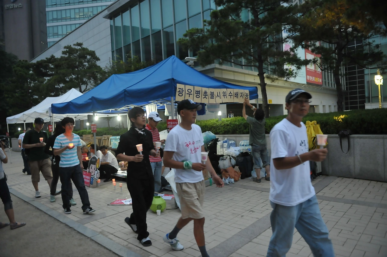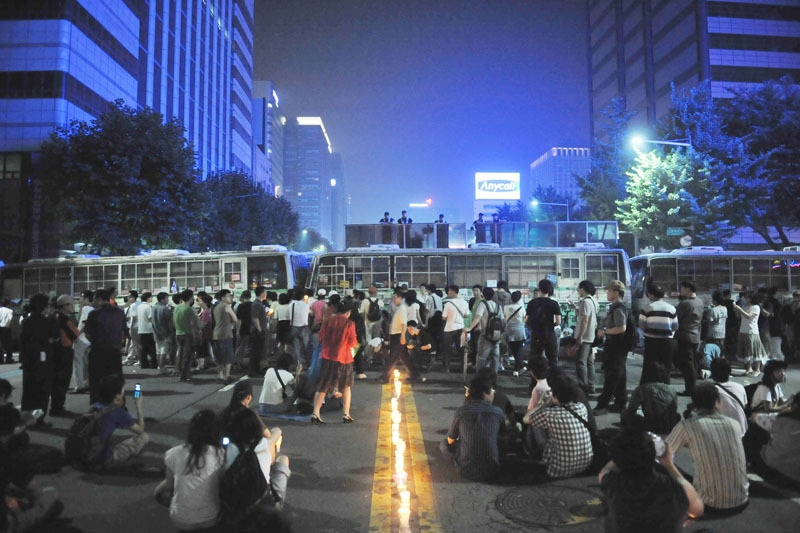 2008년 4월29일 <PD수첩>의 보도는 한미 쇠고기 협상 내용에 대한 국민들의 여론을 들끓게 하는 기폭제가 되었고 다음달 5월2일, 이명박 정부의 미국산 쇠고기 수입협상에 대한 반대의사를 표시하기 위해 촛불집회가 처음 열렸다. 먹거리에 대한 시민들의 분노는 대단했었다. 남녀노소 각자의 피켓을 들고, 다양한 구호도 많이 보여졌다. 직장인이었던 나는 청계광장에 모인 집회에 기록을 하게 된 것이 1년간 집회 사진을 기록하게 되었다. 매주 열리던 집회는 광화문사거리를 넘지 못했다. 차벽으로 온통 막아놨기 때문에 시민들의 집회는 청계광장, 시청광장에서 열렸고, 집회가 끝나면 을지로, 서대문으로 행진을 이어갔다. 그러나 광화문을 넘어 청와대로의 길은 막혀 있었다. 버스는 우회했고, 당시 부암동에 살았기 때문에 집을 가지 못하고 시위대의 행진을 찍고 집에 들어가면 12시를 넘곤 했다.