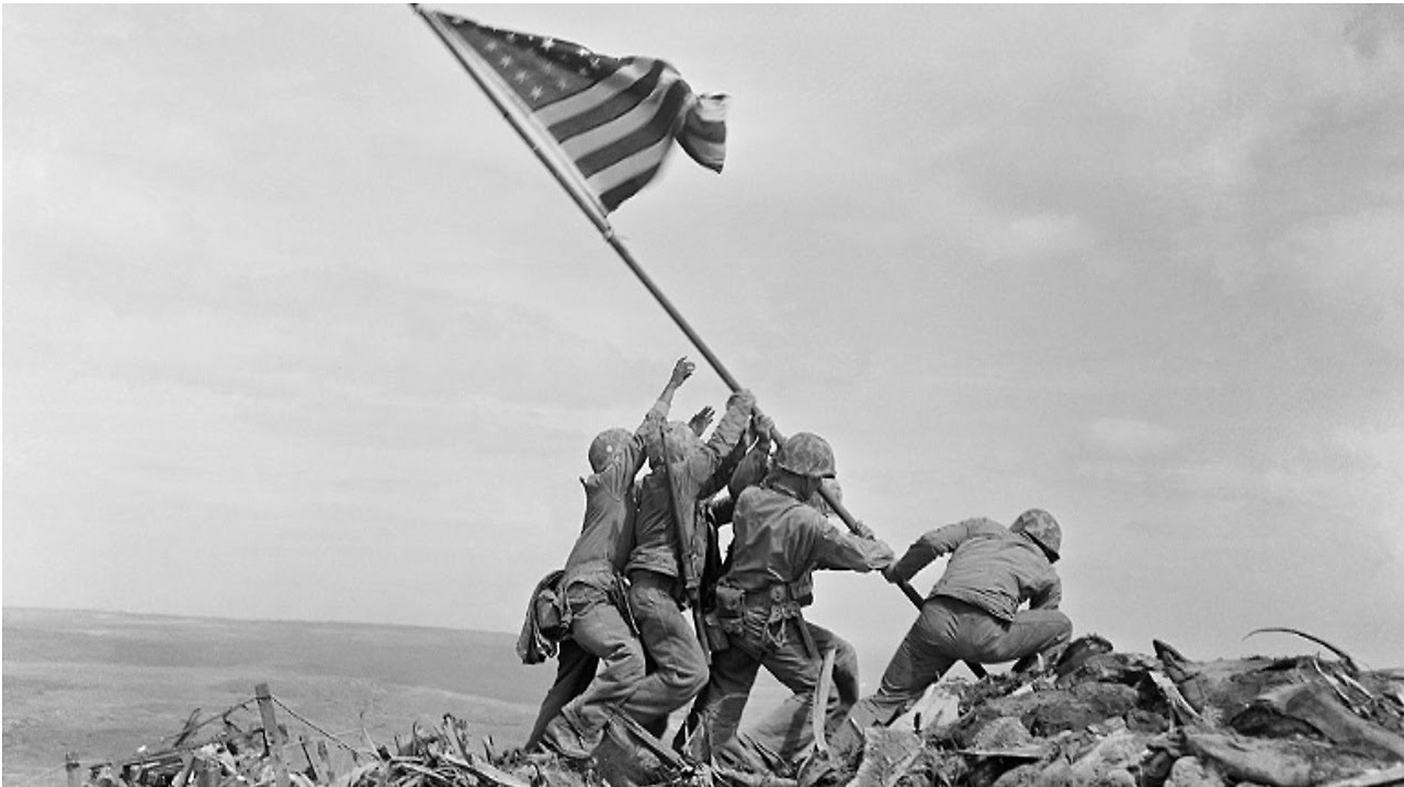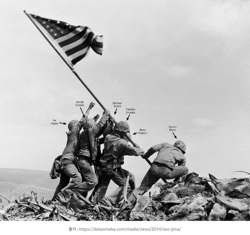 1945년 2월 AP통신 사진기자인 ‘조 로젠탈’이 촬영한 이 사진은 2차세계대전에서 미군의 승리를 상징하는 유명한 사진이다. 이 사진은 일본과의 전투에서 미군이 이오지마섬에 상륙한 후 5일간의 전투 끝에 수리바치 산 꼭대기에 거대한 성조기를 6명의 미해병대원이 꽂는 순간의 장면이다. 그러나 이 사진은 연출되었고, 두 번에 걸쳐서 다시 촬영했다고 한다.