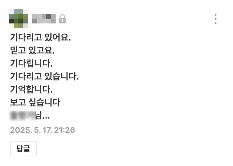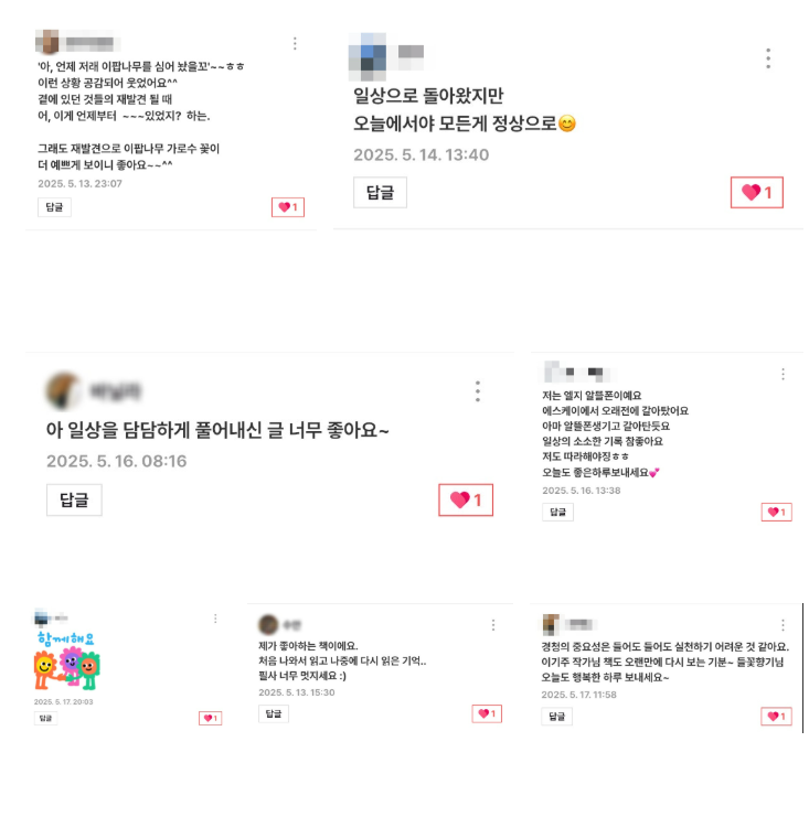 이런 감동의 메시지를 남겨준 이웃이 있었다. 흑흑흑 내가 뭐라고 이리도 사랑을 주시는지 너무나 고마웠고 또 고마웠다. 나를 기다리는 이웃이 있어서 참 행복했다. 따뜻한 마음을 가지고 있는, 다정한 흔적을 남겨준 이웃을 사랑한다.