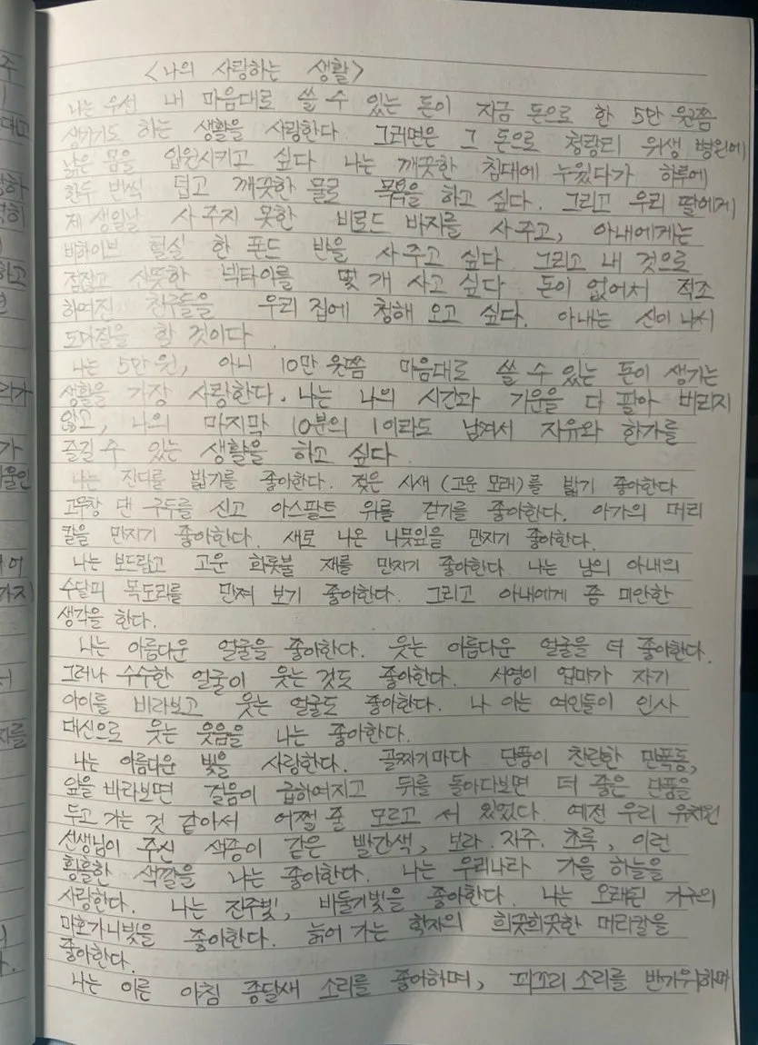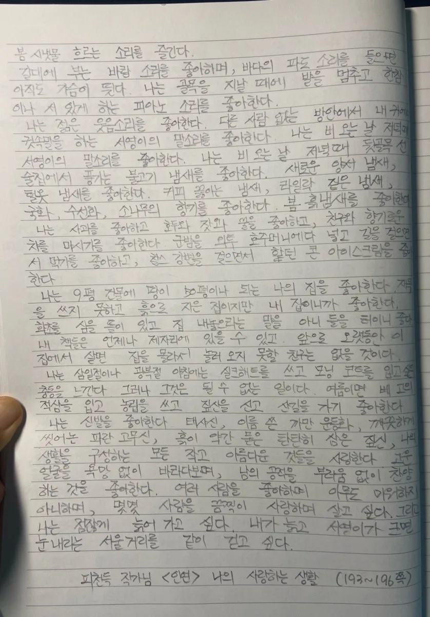 필사를 사랑한다. 필사하고 싶은 문구를 만났을 때, 공책과 연필과 지우개가 준비됐을 때 나의 가슴은 뛰기 시작한다. 연필은 사각사각 소리를 내며 책에 있는 문구를 공책으로 옮겨준다. 틀린 글자가 있을 때, 글씨가 마음에 들지 않을 때 지우개는 그 흔적을 깨끗하게 지워준다. 공책에 쓰인 나의 글씨를 보며 나의 손끝과 나의 마음속에 아름다운 문장들이 녹아들어 갔을 거라 상상하며 행복감에 젖어든다. 공책을 선물해 준 친구의 마음을 떠올리면 남부러울 것이 없어진다. 이 모든 것을 사랑한다.