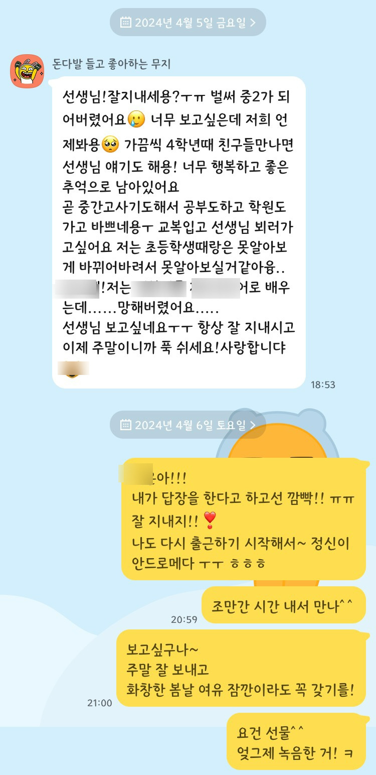 그 아이들은 지금 중학교 2학년이다. 나는 학생들에게 휴대전화 번호를 가르쳐 주지 않지만 그해는 예외였다. 마지막에 나의 휴대전화 번호를 물어보는 아이들에게 번호를 공개했고, 한동안은 연락을 주고받기도 했다. 특히 나에게 마스크를 벗어보라고 말했던 여학생은 올해에도 소식을 전해 주었다. 4월까지 연락이 왔었구나. 작년엔 휴직 상태였기 때문에 올해 복직하면 학교로 놀러 오라고 했는데, 아마 공부하느라 바쁜 것 같다.