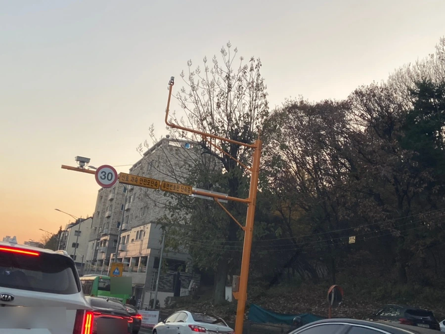도로 폭이 넓고, 통행량이 그다지 많지 않아서 차들이 속도를 내는 구간이 있어요. 늘 '안전운전'을 외치는 1인이지만 저도 모르게 속도를 내는 그 구간이요. 계기판의 속도를 확인하고 화들짝 놀라곤 하죠. "단속 중"이라는 표지판이 있지만 단속 카메라가 없는 경우에는 특히나 유혹이 많고요.