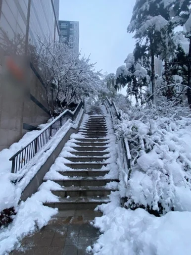 엘리베이터를 기다리며 바라본 창밖 풍경, 안에서 보니 정말 장관이었다. 이런 날, 집에만 콕 박혀 있을 수 있다면 얼마나 좋을까?