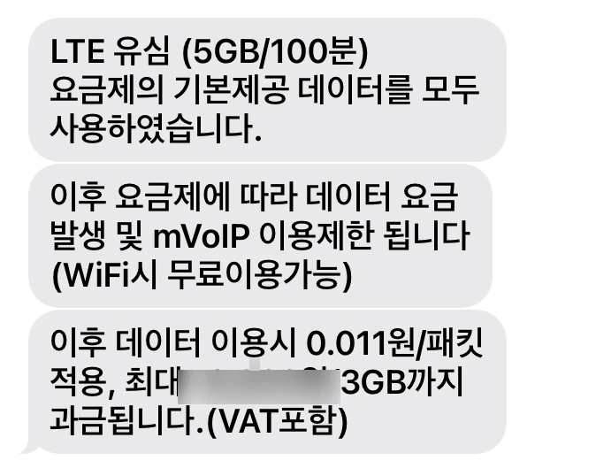 LTE 유심( 5G/100분) 요금제의 기본 제공 데이터를 모두 사용하였습니다. 이후 요금제에 따라 데이터 요금 발생 및 mVolP 이용 제한됩니다.