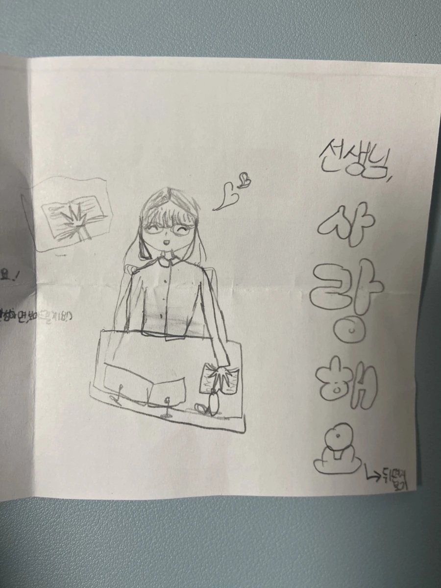 이 사람 누구야? 나 맞니? 너무 예쁘게 그려줘서.... 다른 선생님 생각한 거 아닌지 묻고 싶구나! 실물화상기에 비친 나의 손을 그린 거 보니 나 맞는 것 같아. 고맙구나. 나를 이 모습으로 기억해 주길!