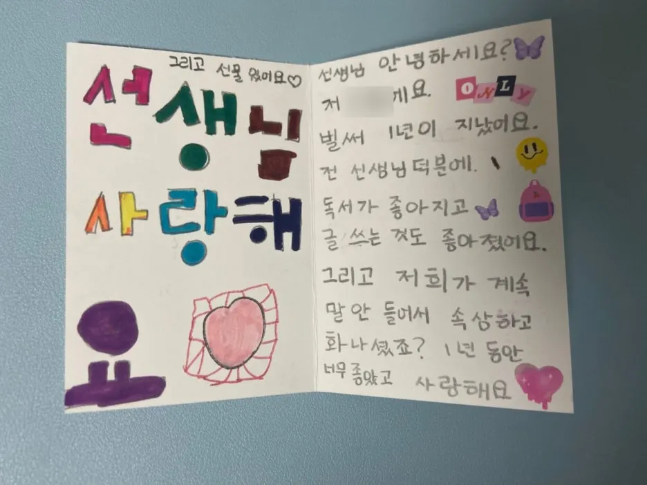 스승의 날 -개인적으로는 이날을 거부하고 있단다-이며 방학식 전날이며 너희들은 가끔 나에게 편지를 건넸지만 우리가 헤어질 때 달라고 너희들을 돌려보냈었지. 선생님은 그 무엇도 받지 않을 거라 미리 단단히 일러두었기에 '정말로?' 라 생각했던 친구들은 한두 명에 불과했지만, 그때 참 미안했어. 누군가 선생님에게 편지를 보내면 혹시나 '차별한다'라는 편견이 생길까 봐 두려웠단다. '내년 스승의 날, 그 편지 꼭 줘!'라는 말을 잊지 않았으면 해. 나에게 너희들의 꼬물꼬물 편지보다 큰 선물은 없으니까 말이야.