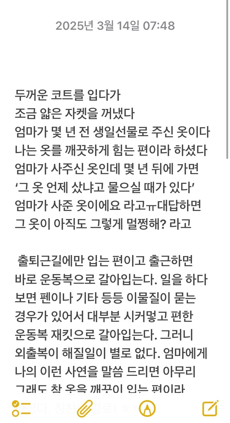 기분 전환을 위해 가벼운 옷을 꺼내 들었던 출근길이었다. 보통의 봄날과는 달리 3월 중순 기온에 맞는 옷을 입고 출근한 오늘, 내가 갖고 있는 꽤 괜찮은 옷들을 선물해 주신 엄마에서부터, 옷을 대하는 나의 자세 확인을 거쳐, 나와는 달리 옷을 험하게 입는 작은 언니에 대한 생각까지 이어졌다.