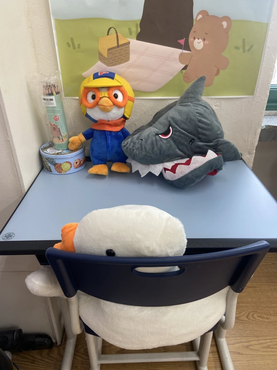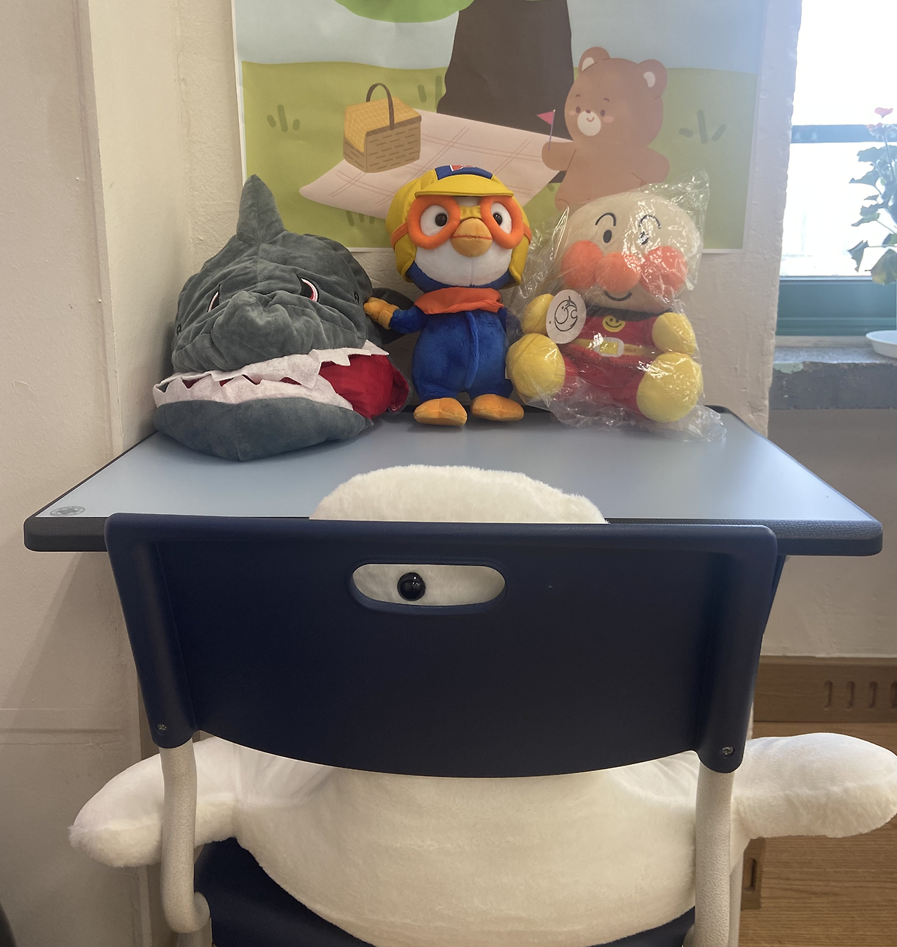 사실 계획만 잘 세우면 학급비로 물품을 구입할 수는 있다. 그런데, 항상 필요한 물품은 계속 생기기 마련. 어차피 일 년 내내 사용할 수 있고 또 운이 좋으면 이듬해까지 활용이 가능하기에 나에겐 자산과도 같다. 그래도 학생들에게 티는 팍팍 내는 편이다. 그래야 감사한 마음도 가질 수 있고, 또 물건도 소중히 다룬다. 그렇게 탄생한 공간이다. 아직까지 저 자리에 앉아 있는 학생은 없었다. 쉬는 시간에 인형을 가지고 유치원생처럼 노는 모습으로 미소를 선물해 준다. 아직까지는.