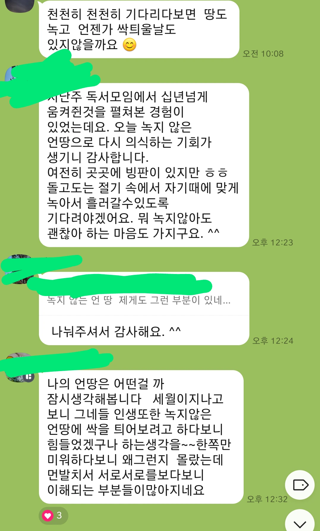 '나에게 녹지 않는 언 땅이 있다면 무엇일까?'라는 질문에 대한 답으로 올라오는 한 사람 한 사람의 톡에 잠시 머무를 수밖에 없었다. 담담하게 속 깊은 이야기를 꺼내 주셔서 너무 고마웠다. 봄과 겨울이 오고 가는 절기를 바라보다 보니, 내 안에서 봄과 겨울이 오고 가는 것도 가만히 지켜볼 수 있는 힘이 생겼다. 내 마음이라도 '봄이 왔으니 어서 겨울은 물러가라' 할 수 없음을 받아들인다. 어둡고 그늘져서 가장 늦게 봄볕이 스며드는 곳이 어디에나 있듯이, 내 마음에도 그와 같은 응달이 있음을, 내 앞의 당신에게도 당신이 어쩔 수 없는 응달이 있음을 떠올려본다.