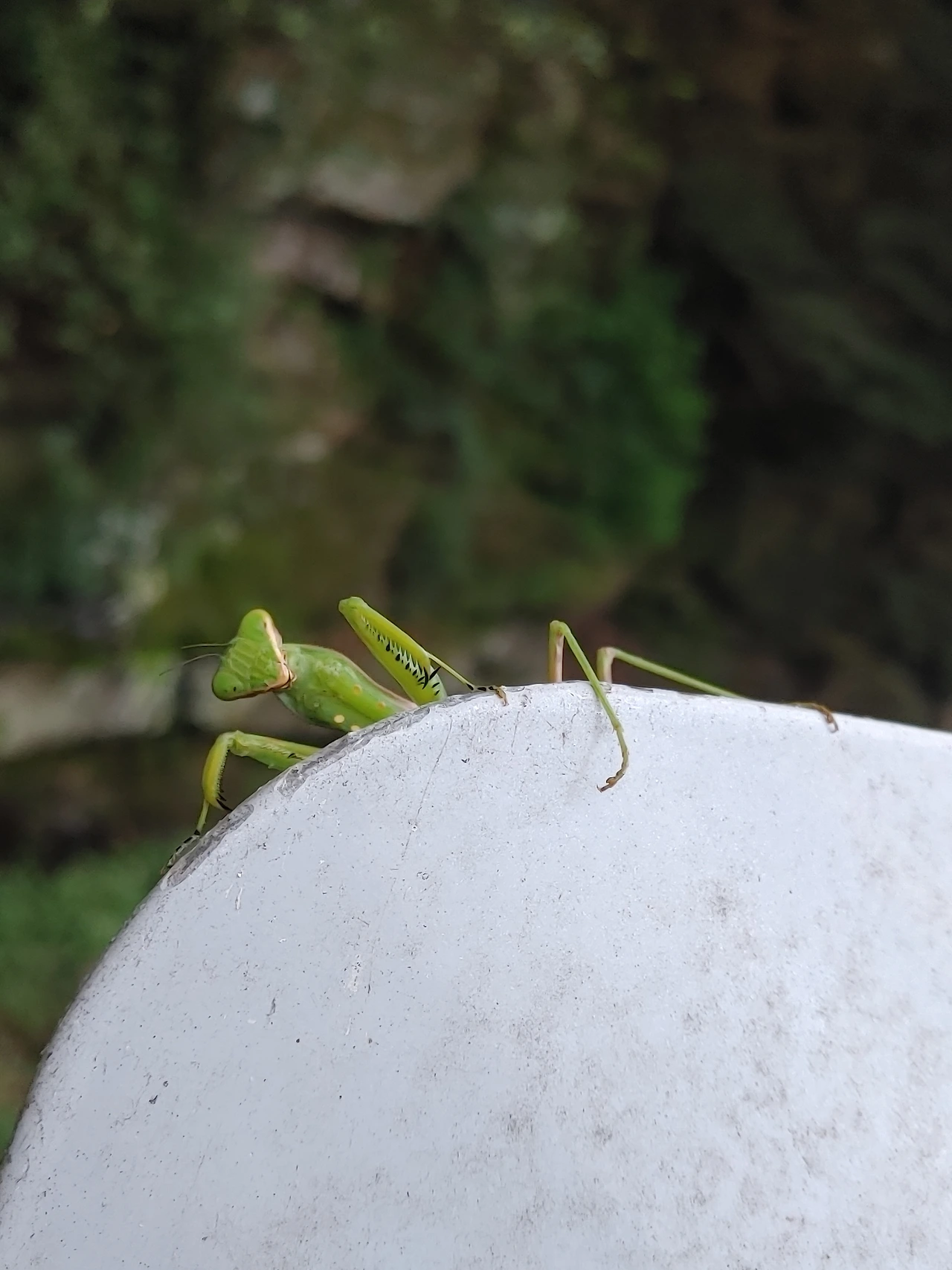 개울 난간에 매달려있길래 몸을 낮춰 가만히 봤더니, 사마귀도 내가 신기한지 고개를 갸웃하며 나를 바라보는 것이다.