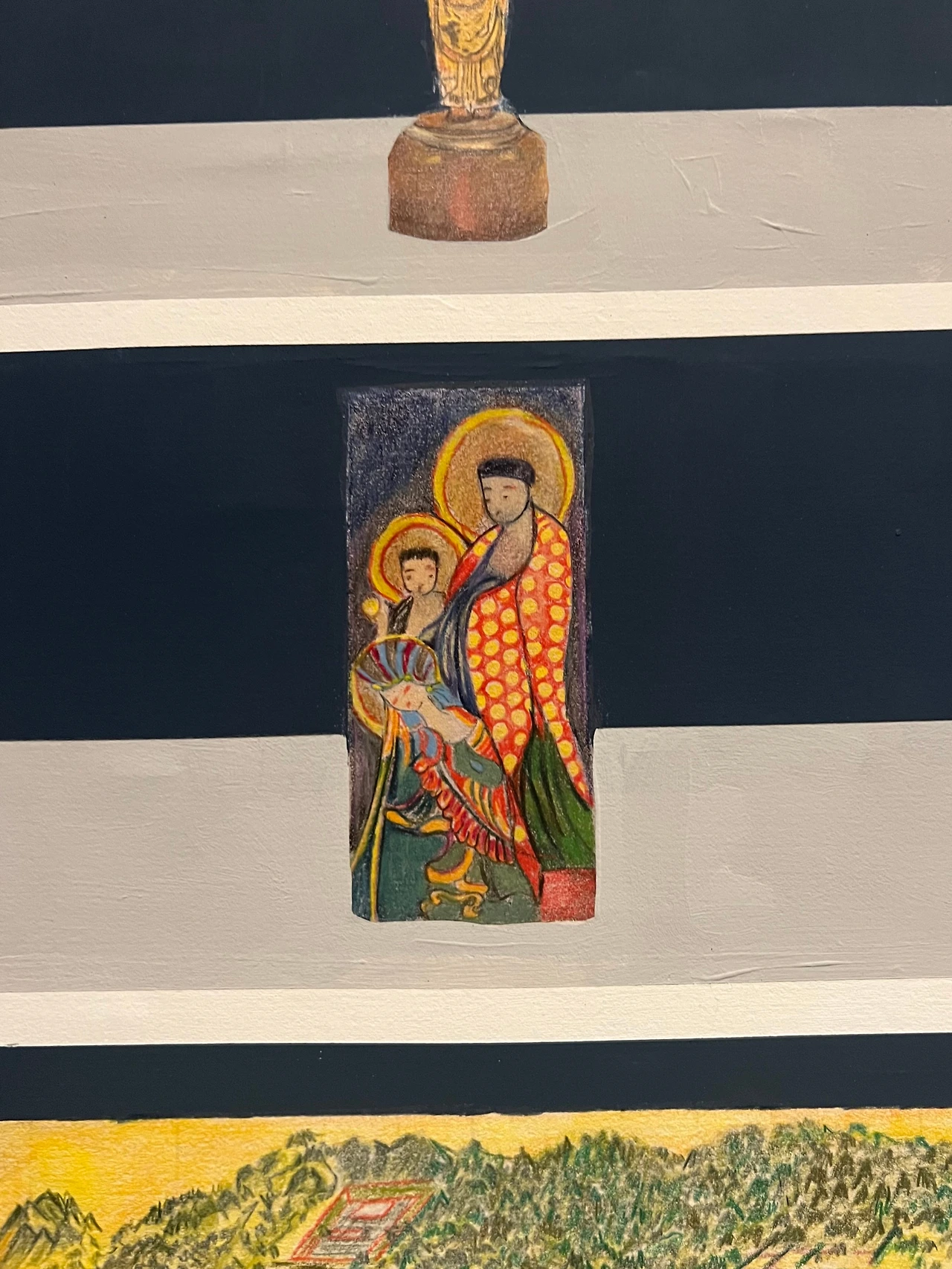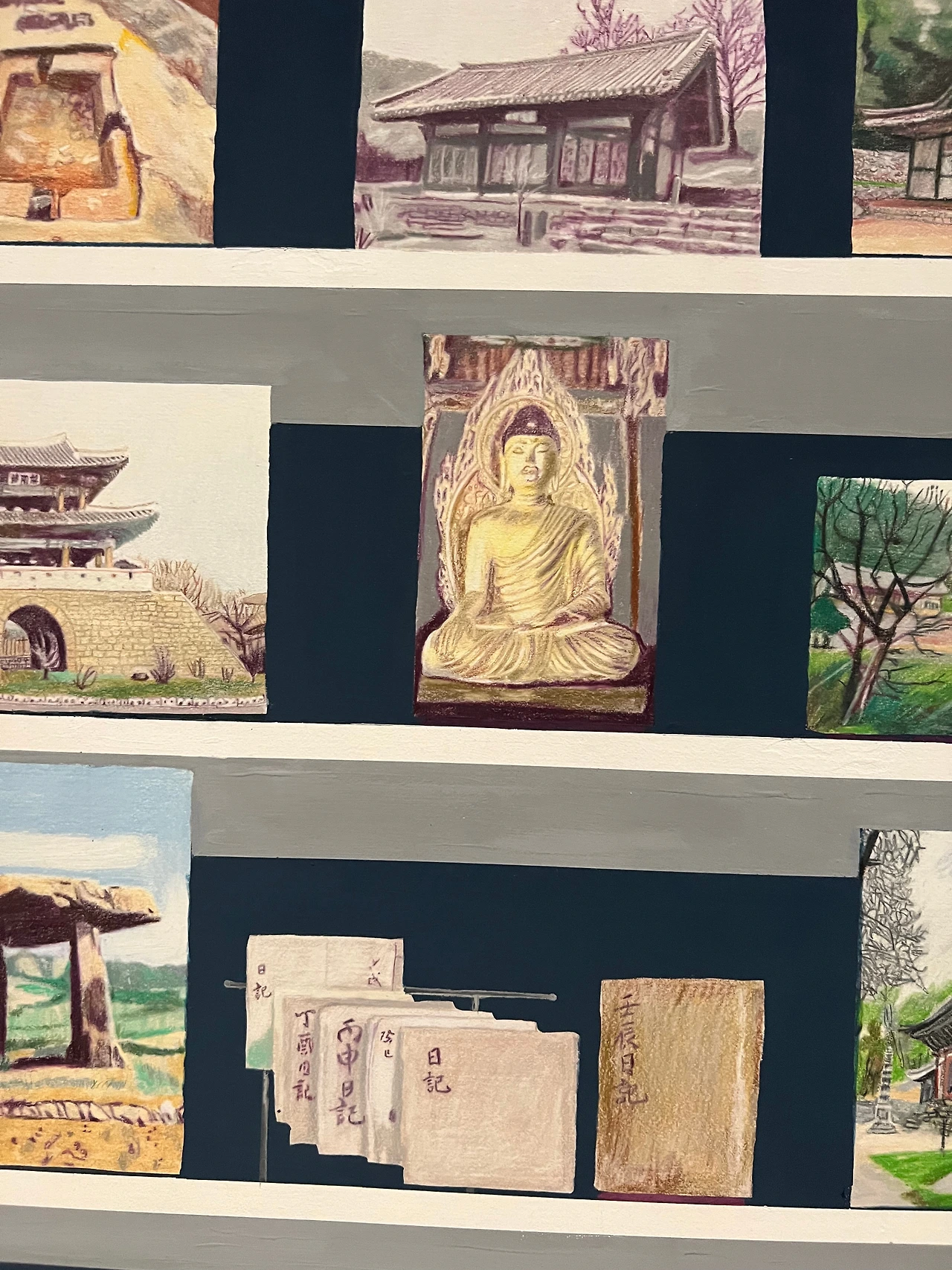 남한의 국보 1호인 숭례문이 제일 먼저 그려져 있고 그다음이 북한 국보유적 1호 평양성을 그렸다. 다음 순서는 남한 국보 2호 원각사지 십 층 석탑, 북한 국보유적 2호 안학궁터 ... 이런 식으로 남한과 북한의 국보들이 번갈아가며 그려져 있다. 아래줄로 갈수록 그림이 빼곡하지 않고 듬성해지는 것은 북한의 유물수가 남한보다 적기 때문이라고 한다.