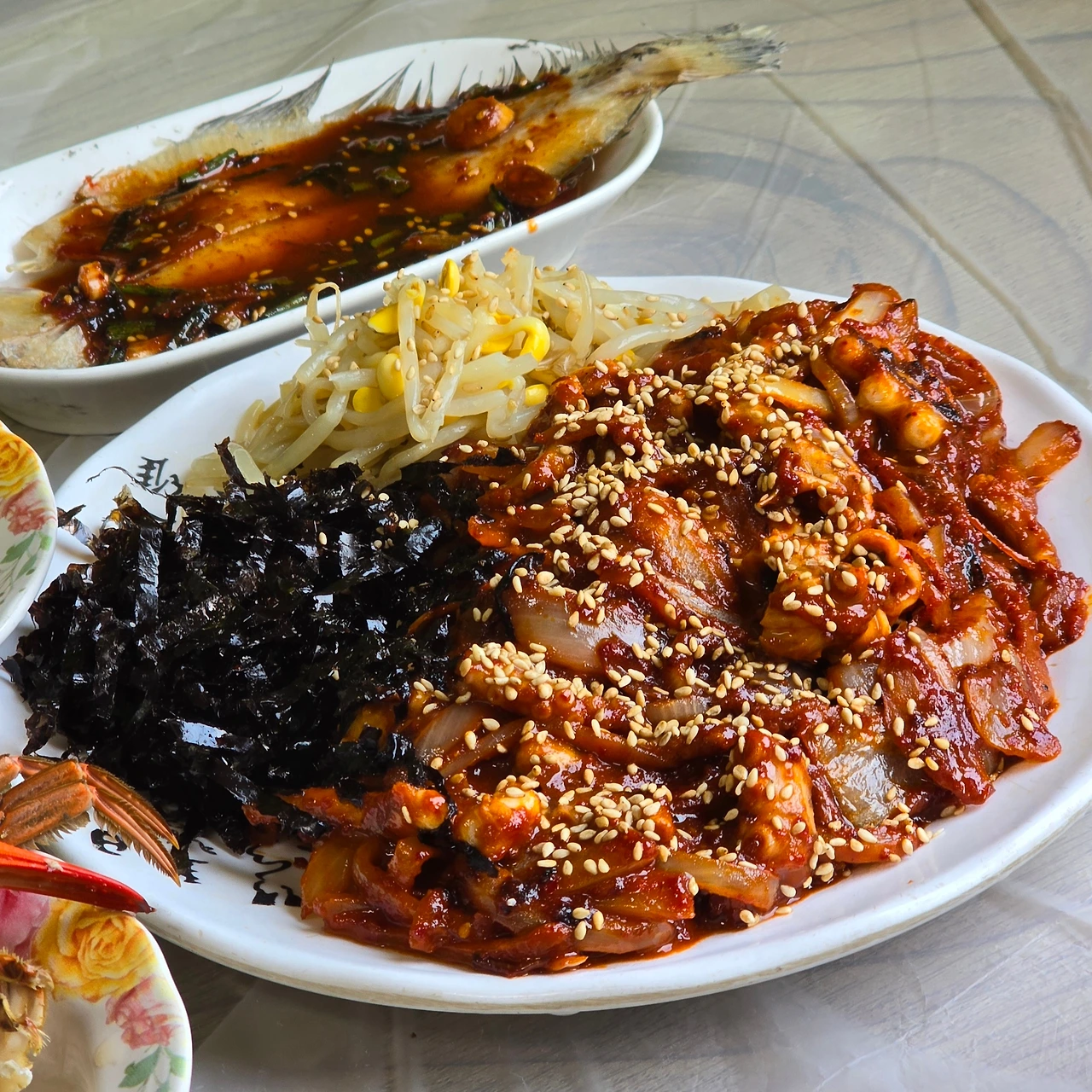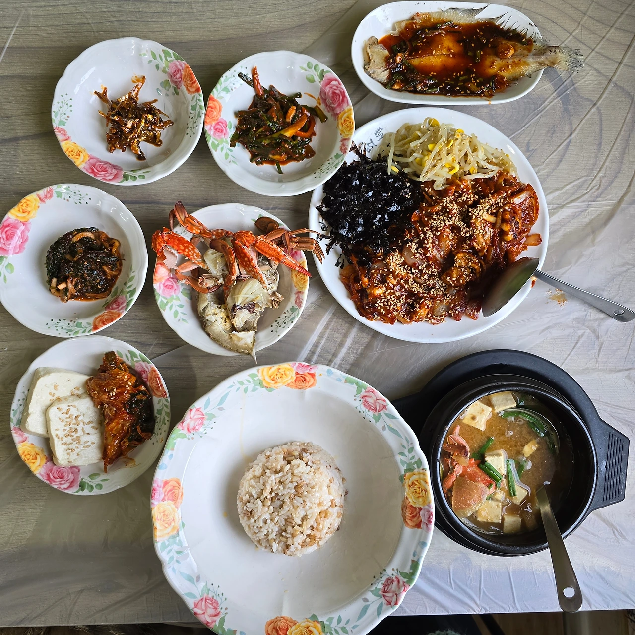 보리밥과 함께 제공된 반찬들은 전부 바다의 풍미를 가득 담고 있었다. 김치, 파래무침, 멸치볶음, 파김치, 가자미조림, 꽃게찜까지 짭조름하면서도 맵지 않아 밥숟가락을 자꾸만 더 들게 만든다. 낙지볶음은 부드럽고 쫄깃한 낙지에 달콤한 양파와 고소한 깨가 어우러지고, 된장찌개에는 꽃게가 들어 있어 국물 맛이 시원하고 감칠맛이 난다. 이 모든 음식이 구수한 보리밥과 만나, 건강하고 든든한 한 끼를 완성한다.