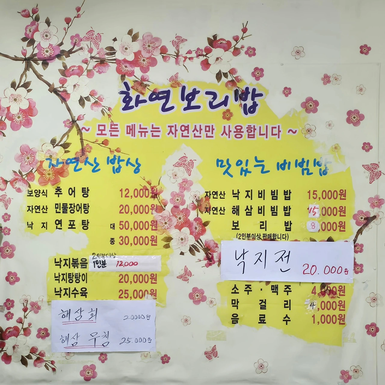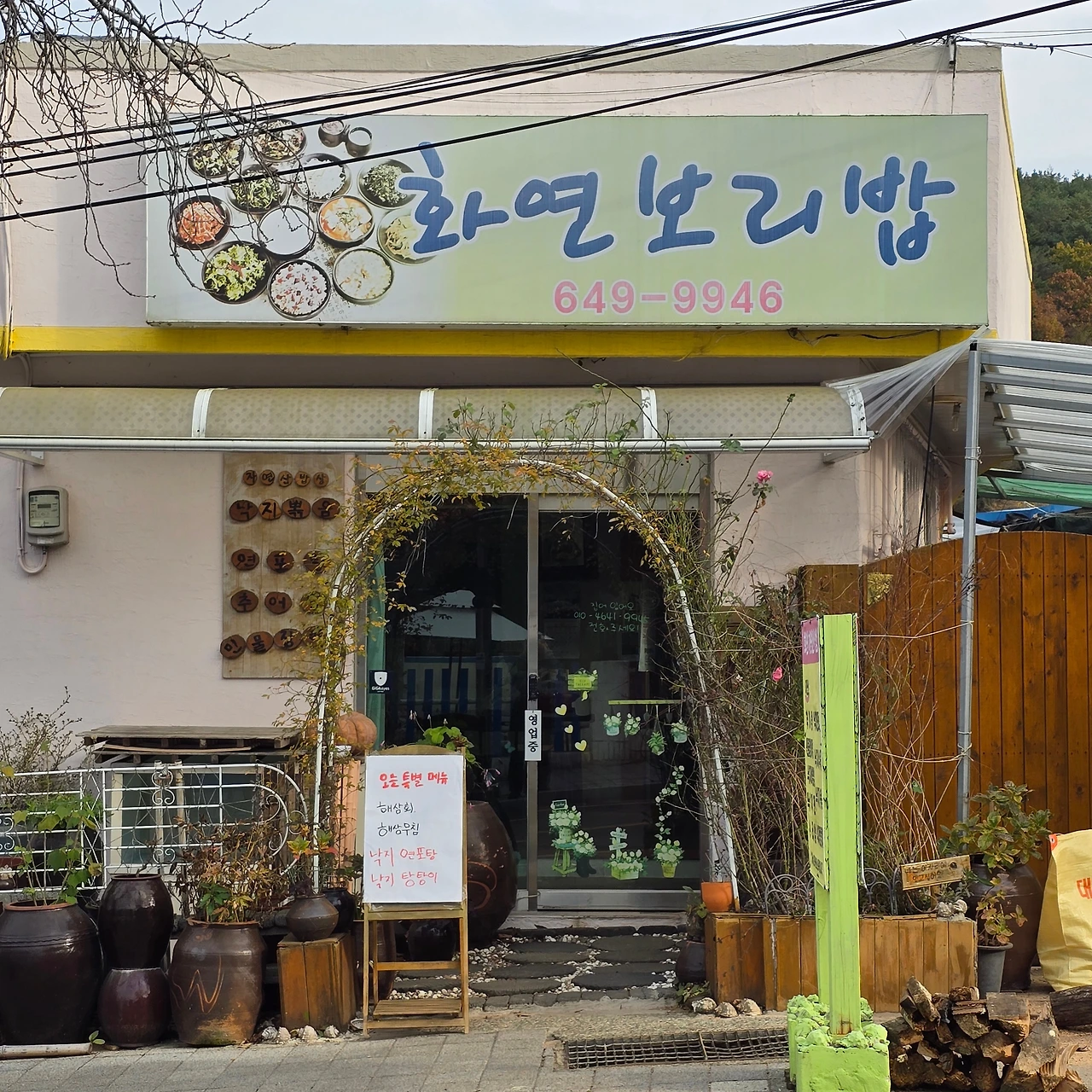 이곳의 대표 메뉴는 보리밥과 낙지볶음이다. 2인분부터 주문이 가능하지만, 혼자서도 꼭 맛보고 싶어 과감히 낙지볶음 2인분을 주문했다. 음식을 기다리는 동안 가게 곳곳을 둘러보았다. 외부에는 화분을 심은 옹기들과 장작과 오늘의 특별 메뉴가 적힌 입간판, 나무 단면을 활용한 메뉴판이 지나가는 사람들의 시선을 끈다. 내부에는 사장님의 영업 철학이 적힌 메모, 각종 약초의 효능을 설명한 글귀, 그리고 짚으로 만든 옛 물건들이 벽에 걸려있다.