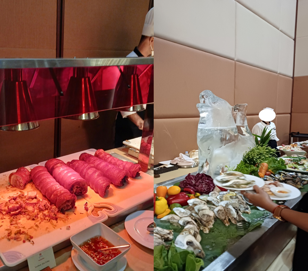 ▲ 만찬에서 맛있게 먹은 대표적 화식의 육류 요리와 생식의 해산물 요리