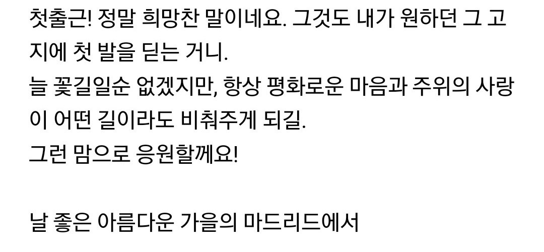 2. 참 마음에 와닿았던 합격 축하와 응원도 있었다. 특히, 참 감사했던 분께서 메일을 보내주셨다. 마드리드에서 인턴을 할 때 뵈었던 분인데 정말 멋있고, 뜨거운 열정이 가득한, 인간으로서 참 닮고 싶은 태 선생님이다. 한국에 오실 때 내가 받은 월급으로 맛난 거 사드리기로 약속했다. 좋아하는 선생님께서도 응원해 주시니, 뜨거운 열정을 품고 얼른 출근하고 싶었다. 스트레스도 크게 안 받고, 교육을 즐겁게 받을 거로 생각했다.