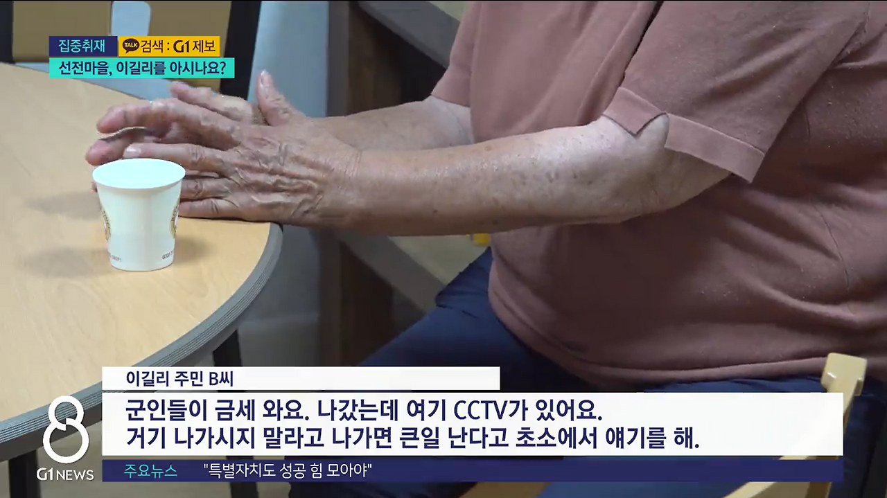9. 어르신들의 사정부터, 댁에 가서 현재 어떻게 살고 계시는지, 수해 이후 공사는 어떻게 됐으며, 지뢰가 발견된 장소는 어딘지, 어르신들을 따라 전부 세심하게 들여다봤다. 최근처럼 남북관계가 경색될 때마다 불안감은 반복됐고, 저녁에 산책하러 집 밖을 나가면 군인들이 금세 와 들어가라고 한단다. “나갔는데 여기 CCTV가 있어요. 거기 나가지 말라고 나가면 큰일 난다고 초소에서 얘기해” 군 당국이 곳곳에 설치한 CCTV의 감시는 일상이 된 지 오래였다.