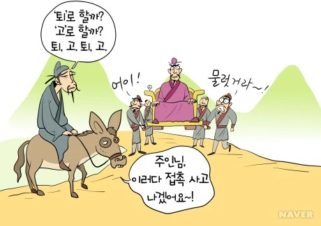 가도는 시종들에 붙잡혀 앞으로 끌려갔다. 다행히 그 관리는 유명한 시인 한유 1)였다. 가도가 길을 막은 사연을 이야기하자 한유는 빙그레 웃으면서 말했다.