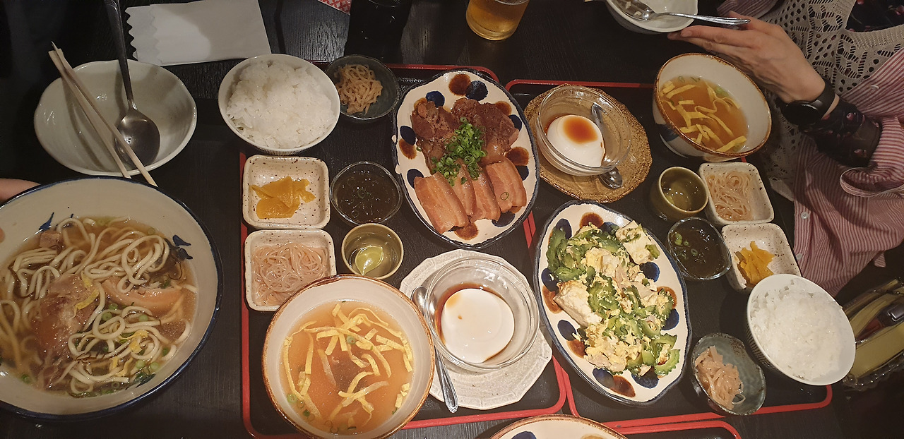 예약은 안 했어도 돌아오는 길에 맛 집 탐방도 빼놓지 않았다. 오늘도 구글지도 활약이 빛나는 시간. 숙소비용을 절약한 돈을 음식에 몰빵 하는 우리는 저녁 역시 한상 가득 늘어놓고 last order 시간까지 식사를 즐겼다. 건강에 좋다는 오키나와 특산 해초들 식감이 좋았다. 빠질 수 없는 오리온 맥주도 당연한 듯 상 귀퉁이를 차지했다.