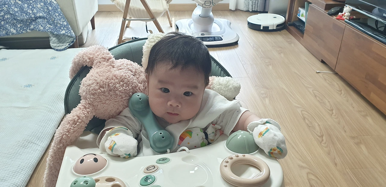 오후 시간에는 액티브한 스케줄이 가득합니다. 최근 시작한 보행기 탑승은 특별한 경험입니다. 복돌이 혼자서 움직인답니다. 물론 앞으로는 아니고 뒤로 가지만 어쨌든 움직인다니까요. 예전 같으면 또 거짓말한다고 하겠지만 요즘은 증거채취가 쉽잖아요. 할머니가 찍은 동영상 보면 아직 세 달도 안된 아기가 보행기로 움직이는 놀라운 장면을 볼 수 있답니다. 물론 너무 일찍 보행기 타면 허리 다칠까 염려하시는 거 알아요. 조심조심할게요.