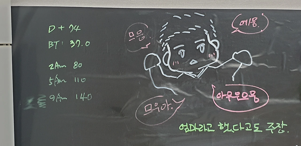 모빌이 옆에는 흑판이 있습니다. 복돌탄생일 카운터와 엄마표 초점그림이 있고 복돌이 일상이 한컷으로 그려져 있어요. 엄마의 재치가 빛나는 흥미로운 공간입니다. 복돌이 하루에 얼마를 먹는지 몇 번을 싸는지도 보여주는 할머니 차트도 있습니다. 재미있는 벽면을 감상하며 나는 오전 낮잠을 청합니다.