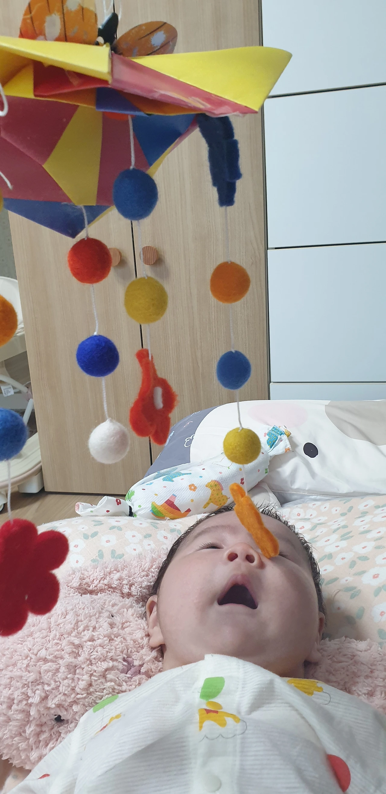 토실이(엄마표 애착인형)와 인사하고 절친 모빌이를 만나러 갑니다. 엄마 솜씨로 재탄생한 모빌이는 복돌이 베프입니다. 초기버전과 리뉴얼버전이 있는데 우열을 가리기 힘들게 둘 다 좋아합니다. 구매대행으로 들어온다는 명품 모빌보다 엄마사랑 가득한 수제 모빌이를 좋아하는 복돌은 안목이 탁월한 F(T 아니고)인 것 같습니다.