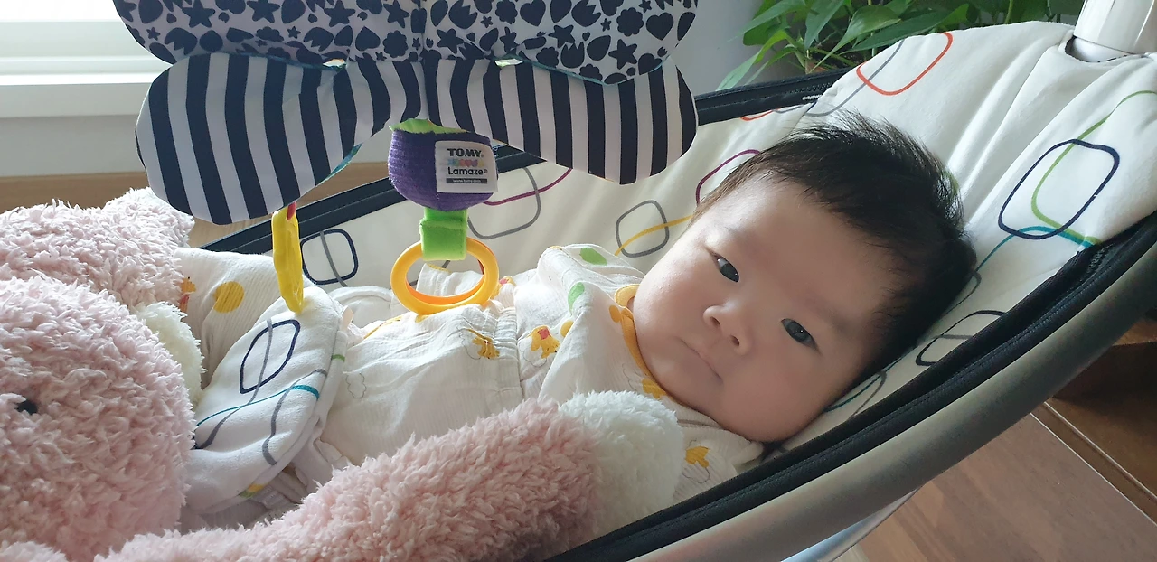 기분 좋게 한잠 자고 나면 브레짜 이모님이 차려주는 분유를 먹고 슬슬 2교시를 시작합니다. 막내할아버지가 보내주신 바운서를 타는 시간입니다. 다섯가지 다른 흔들림을 즐기는데 복돌이의 애착코스는 캥거루모드입니다. 위아래 좌우로 리드미컬하게 흔들리는 액티비티가 익사이팅합니다. 이다음 커서 바이킹을 잘 타기 위한 연습모드라고 생각합니다.
