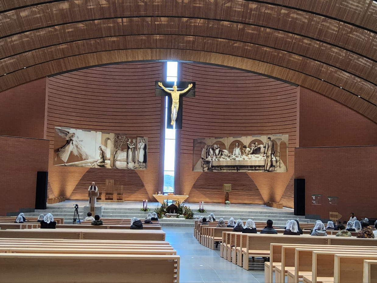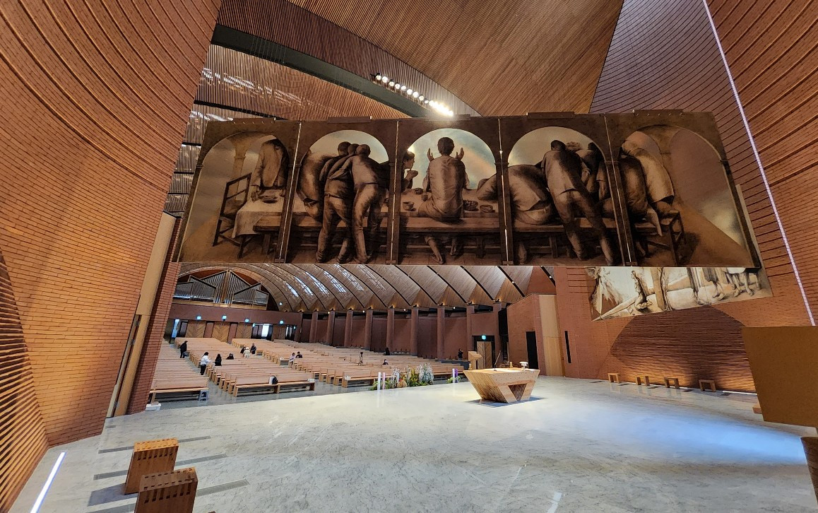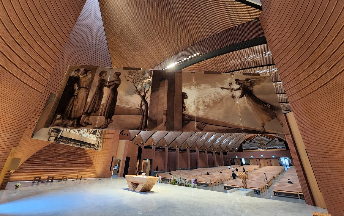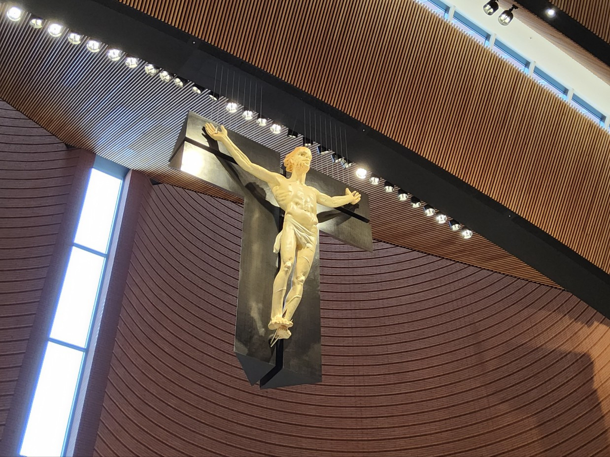 남양 성모성지 대성당. 제대 한가운데 걸린 십자가상과 그 양옆을 지키고 있는 성화는 21세기 미켈란젤로라 불리는 줄리아노 반지의 작품이다. 거대한 십자가상의 예수는 보통 성당에서 볼 수 있는 모습과 많이 다르다. 반지의 예수는 눈을 뜨고 더욱 생동감 있는 표정을 짓고 있는 청년으로 조각됐다. 섬세하게 다듬은 덕분에 실제 머리카락이나 수염이 바람에 날리는 것처럼 보일 정도이다. 내가 어디 있더라도 살아있는 예수님과 눈 맞추고 이야기하는 느낌이 든다.