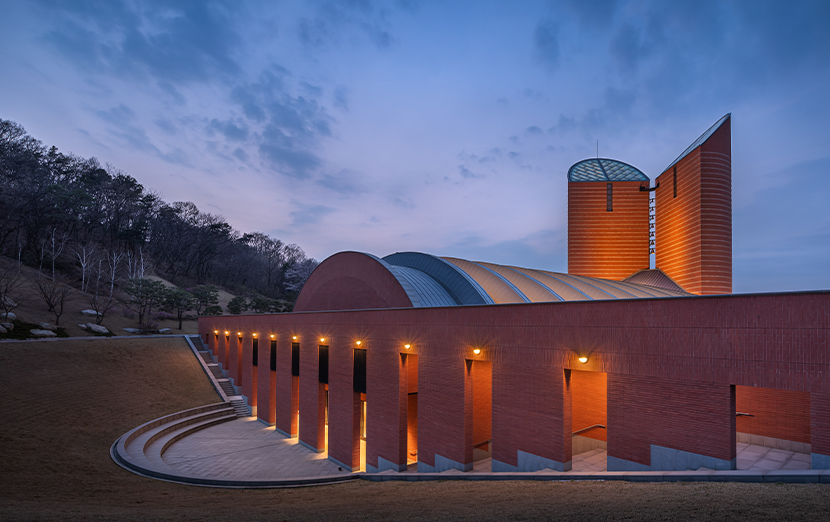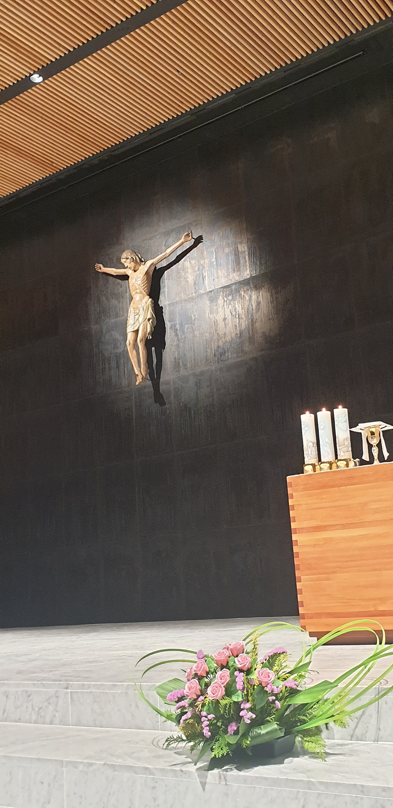 1426년 이탈리아에서 조각된 이 작품은 미켈란젤로가 태어나기 오십 년 전에 만들어진 바로크 양식의 작품이다. 예수님이 마지막 숨을 ‘후’ 내쉬는 형상으로 조각된 국보급 작품. 역시 마리오 보타의 중재가 있어 설치 가능했다고 신부님이 강론 중에 말했다. 예수상이 걸린 뒷벽은 문경한지와 옻칠이 만들어낸 신비로운 빛으로 작품을 더욱 빛나게 했다.