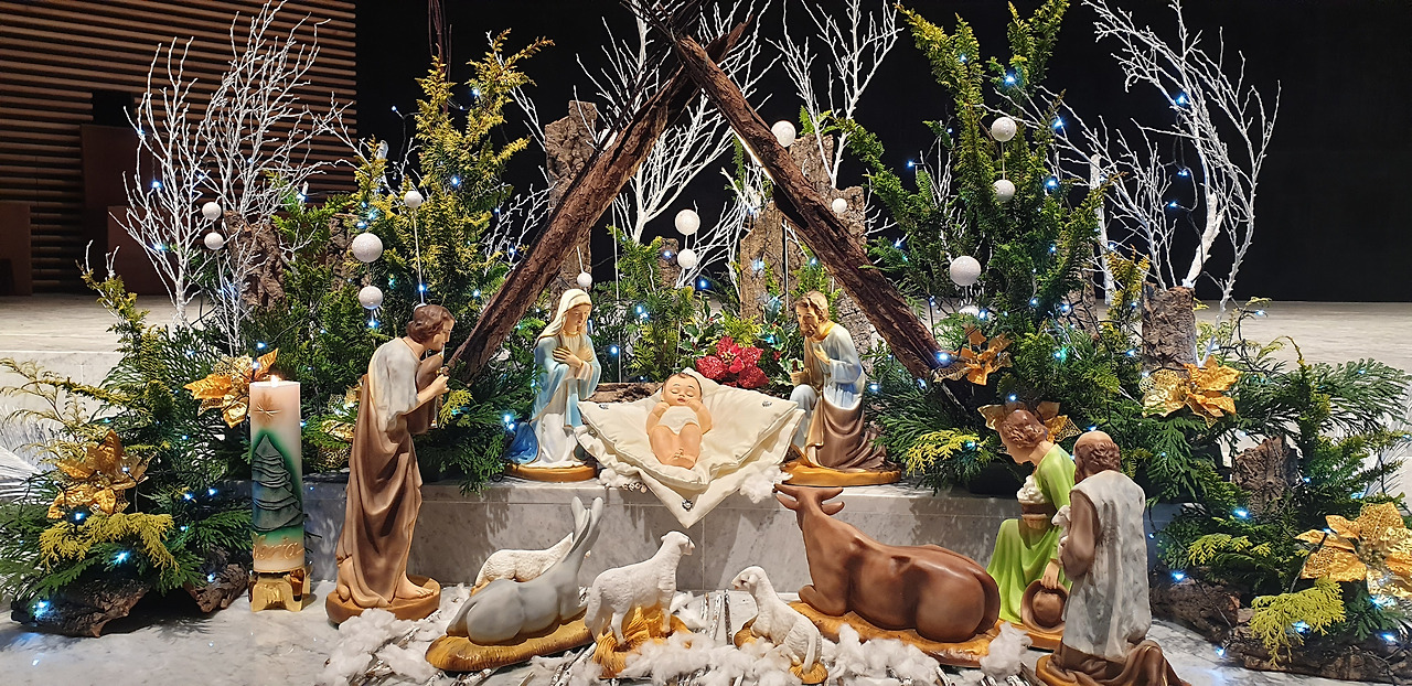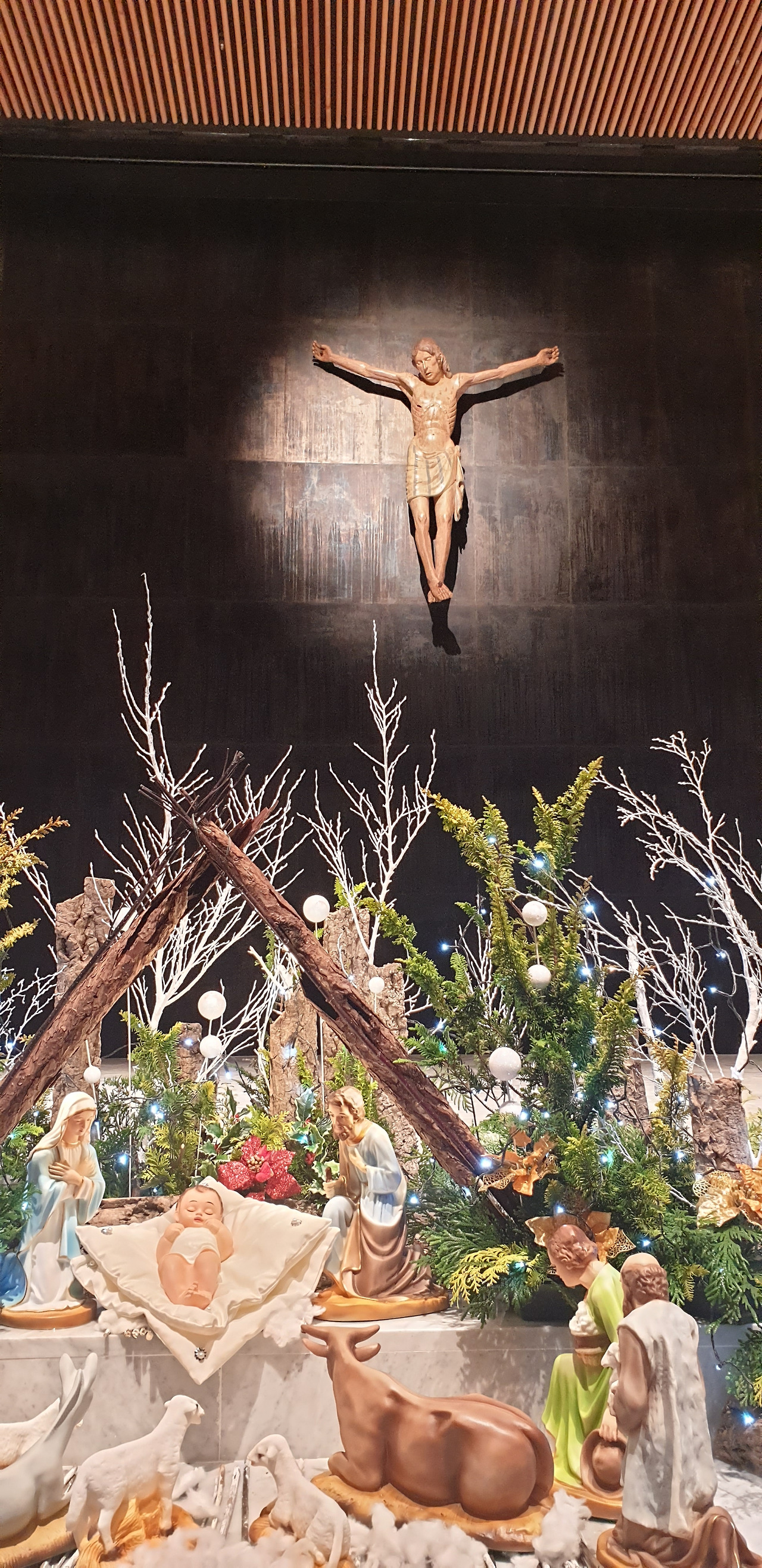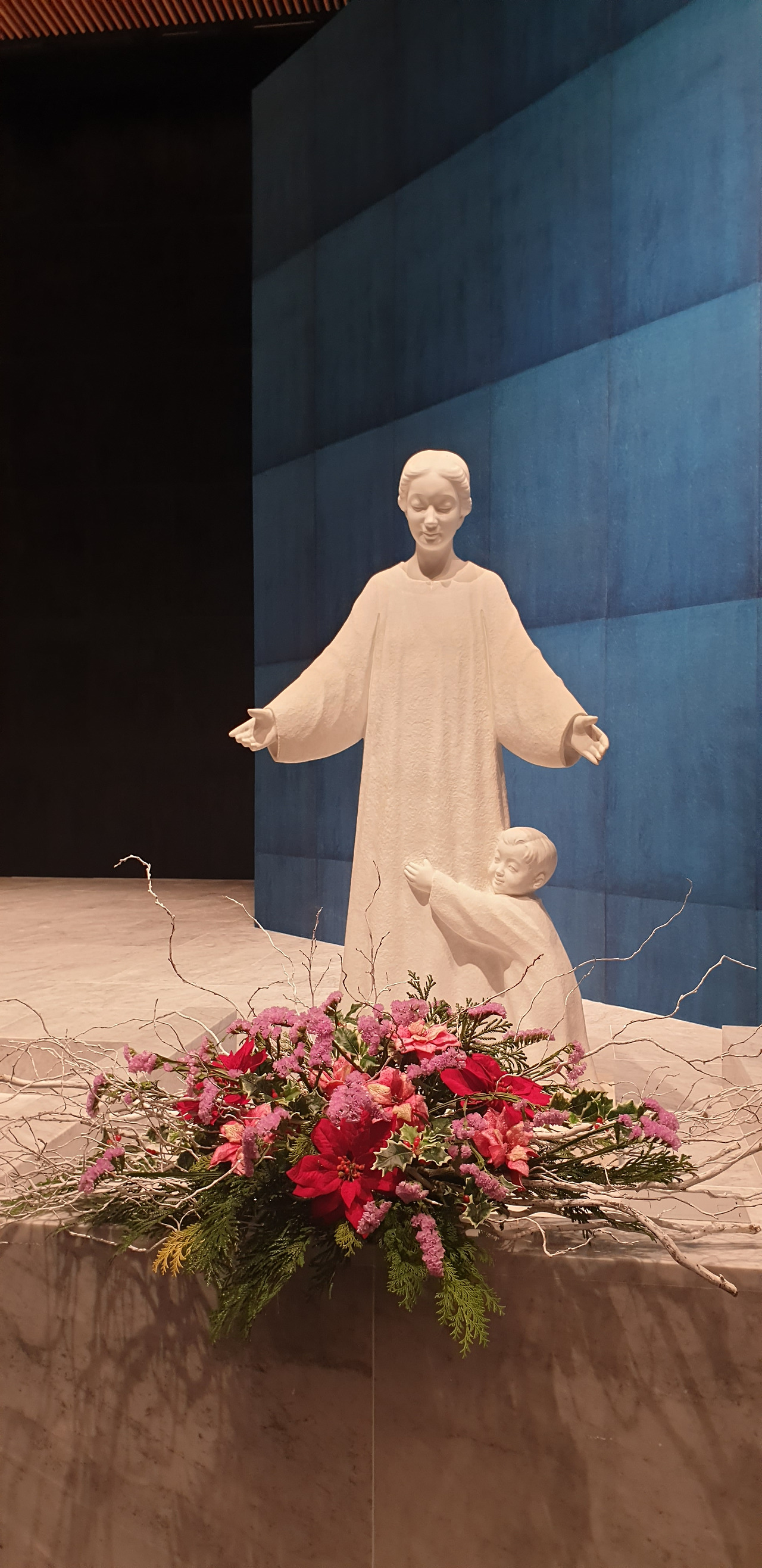 바닥에 설치된 간접조명이 한발 한발 주님께로 나가는 신심을 이끌었고 소성당에 성모님이 막 세상에 오신 아기 예수님을 품 안에 안으신 행복한 날 소성당에 모여 축하하는 신자들 모두 행복했다.